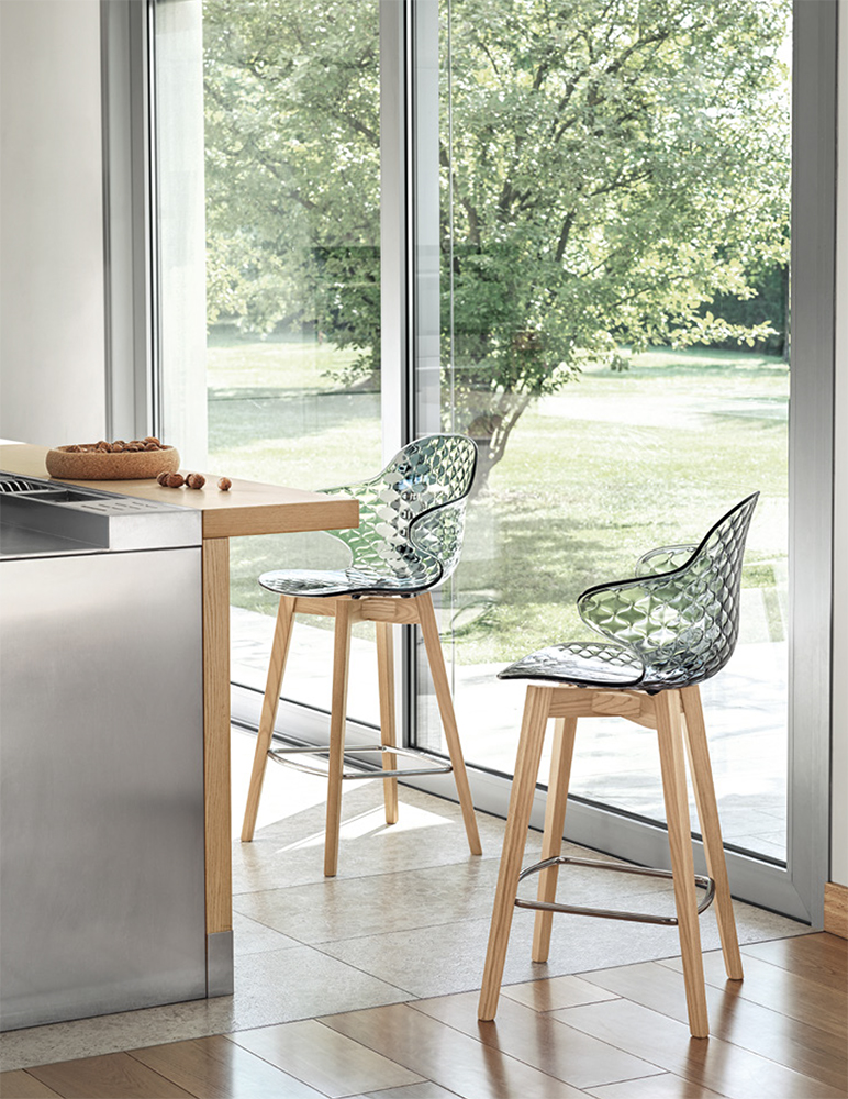 The polycarbonate shell is made in a range of transparent and opaque shades and is mounted on a four-legged wooden base. Choose your favourite.