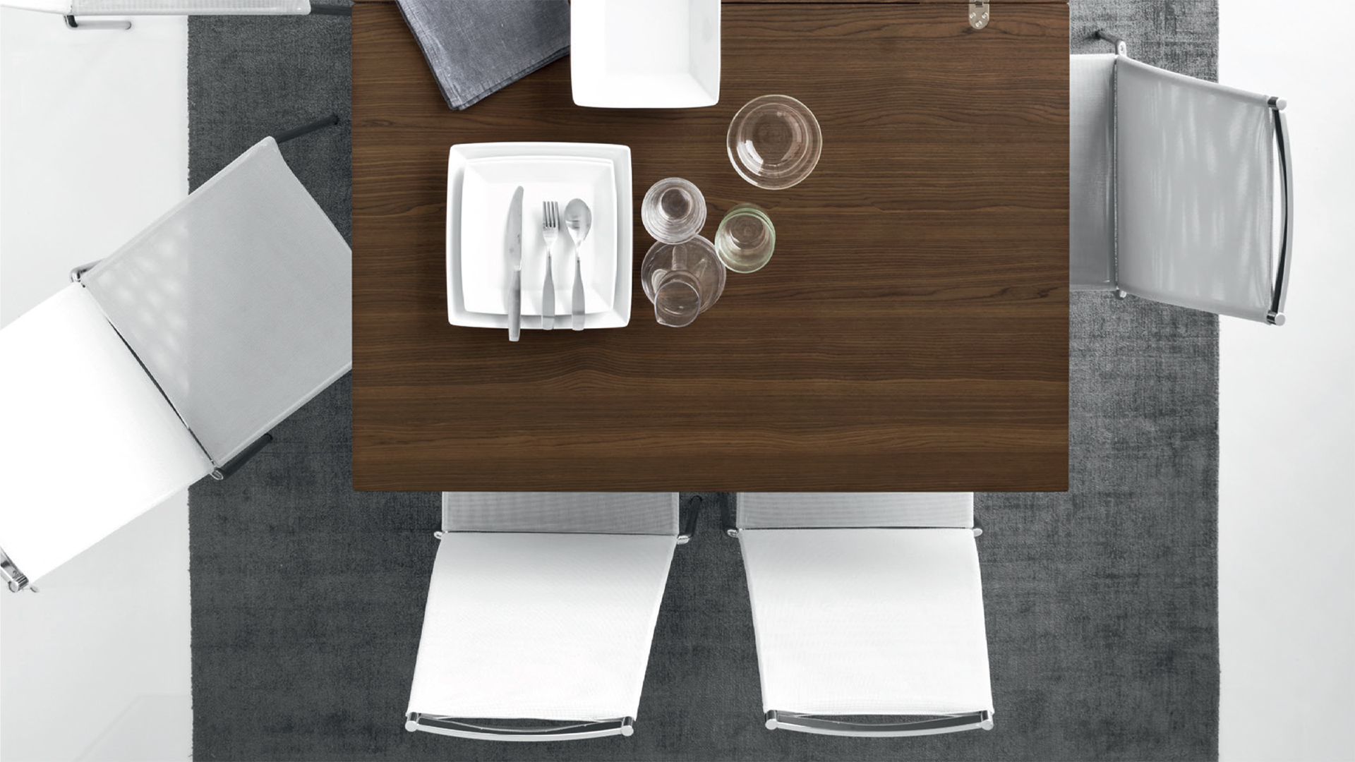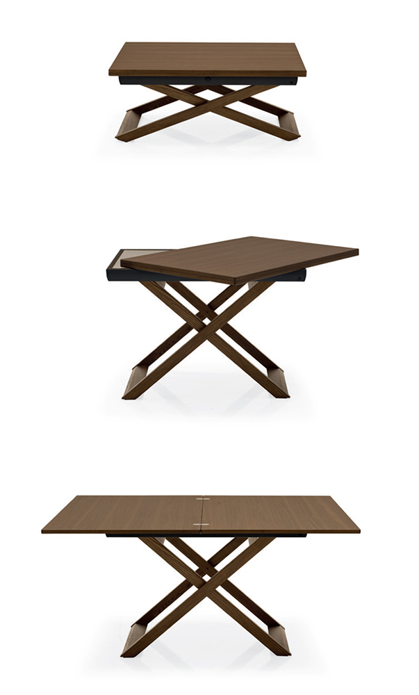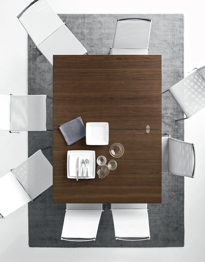 This multifunctional table can be set to seven different height positions simply by pressing the release button and guiding it with one hand, thus transforming it from a coffee table to a dining table for eight people, thanks to the butterfly opening mechanism.