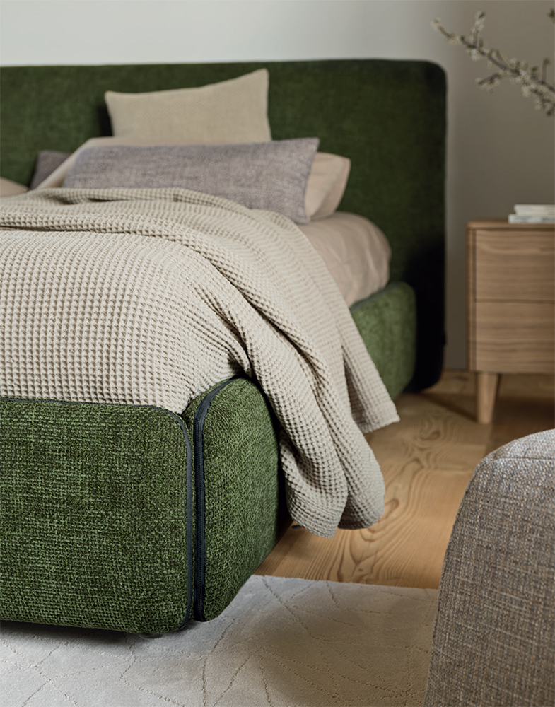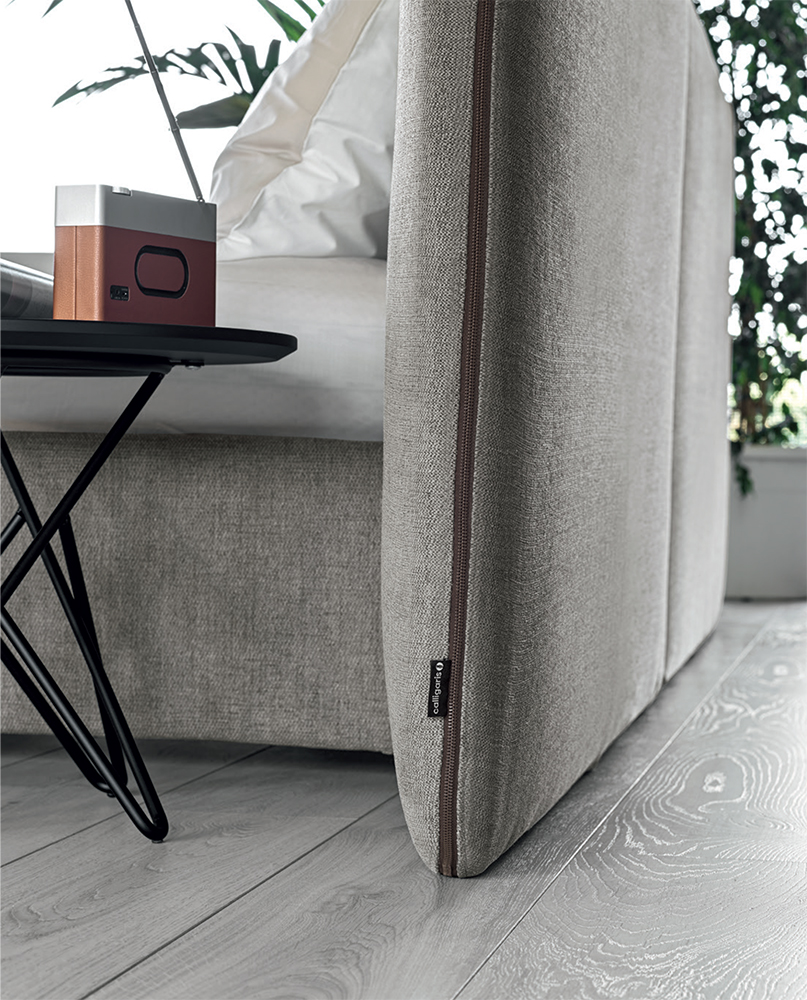 Zip is a versatile, unisex and laid-back project whose sleek design hinges on a common household object - a zip. The Zip is a decorative and functional feature for wrapping the padded panels and transforming simple accessories into a product which can be put together to suit your requirements. The upholstered bed has fully removable covers. This item is available with a plexiglass foot. The Zip bed is available with a fixed bed frame and can be upholstered in fabric or leather with a matching beige, brown, light-grey or dark-grey zip.