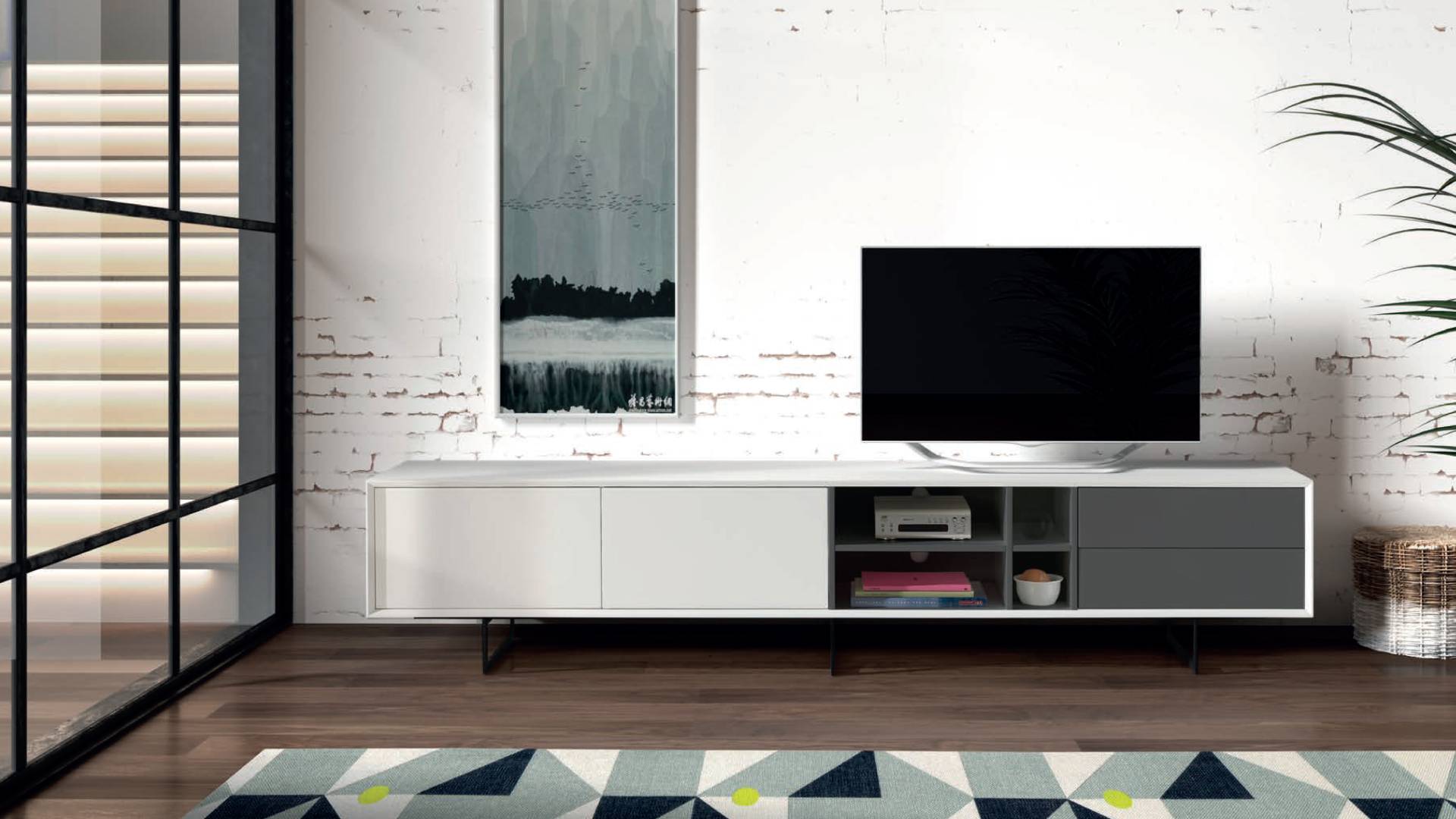 TV Table, 2 doors, 2 drawers, 2 shelves. Push system to open doors and drawers.