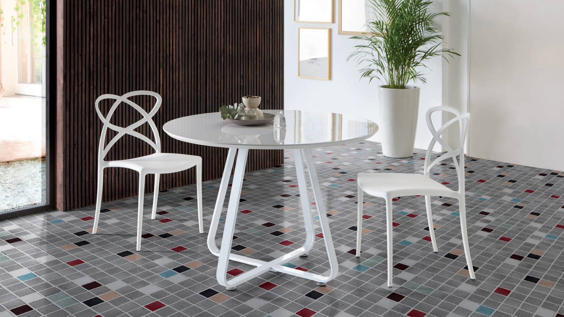 Round Dining Table – Wooden lacquered top – Metal legs.