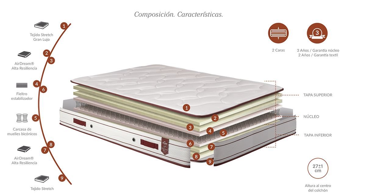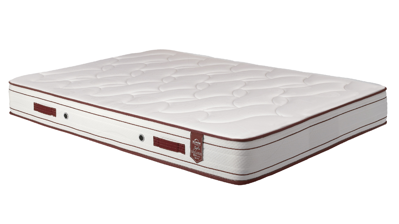 Double-sided mattress upholstered with soft luxury stretch fabric, has padded sides and four horizontal handles for easy turning the mattress and the aeration valves are fixed on the sides to allow the circulation of fresh air.