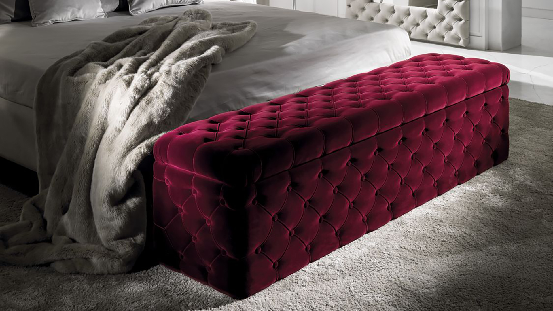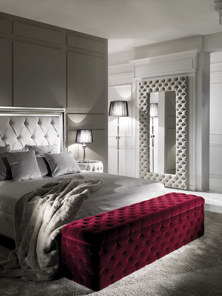 Bench with low legs Avery stands out among other models with its aesthetic appearance. Fabric upholstery with a quilted surface has neat and even seams. This feature adds elegance and nobility to the design. The metal supports are made in an original two-level form.