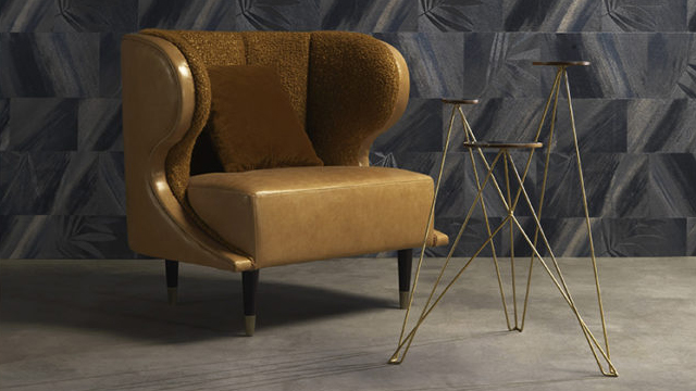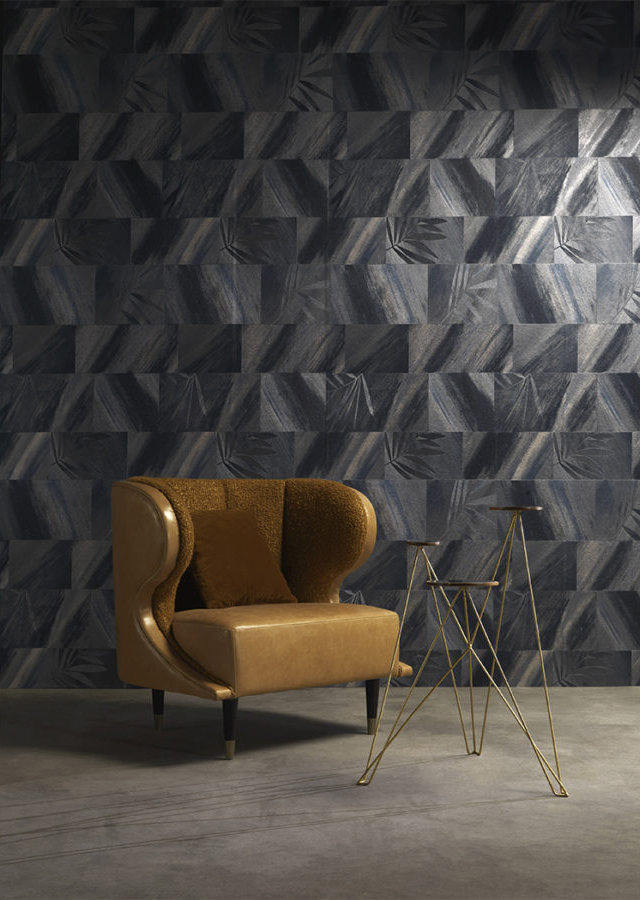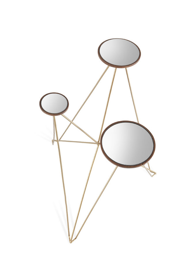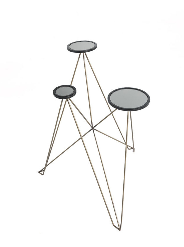A scenography table inspired by the 50s and composed by totemic elements with shelves in black lacquered wood and smoky mirror, creating an original play of different sizes and highs.