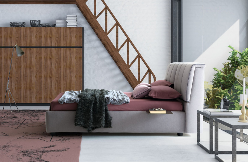 This bed possesses a linear and balanced outline. Nevertheless, it surprisingly reveals how daring a modern furnishing concept can be: its soft headboard, embellished on its surface by symmetrical vertical seams, takes a distance from the usual stillness in order to disclose, at its rear, the existence of a functional storage compartment - that is, a valuable, clever, and easy-to-handle space-saving solution.