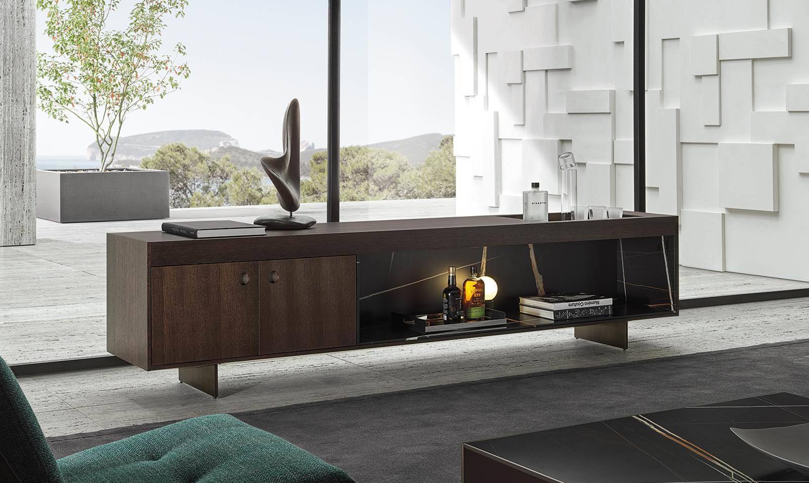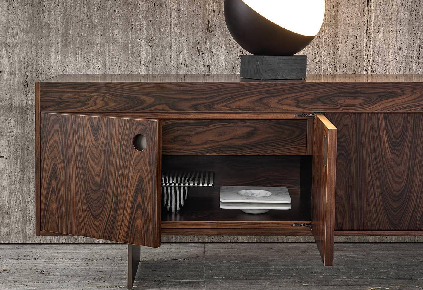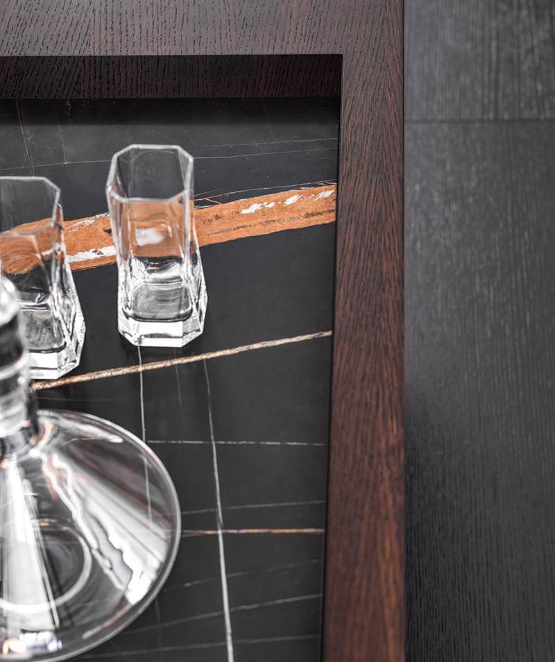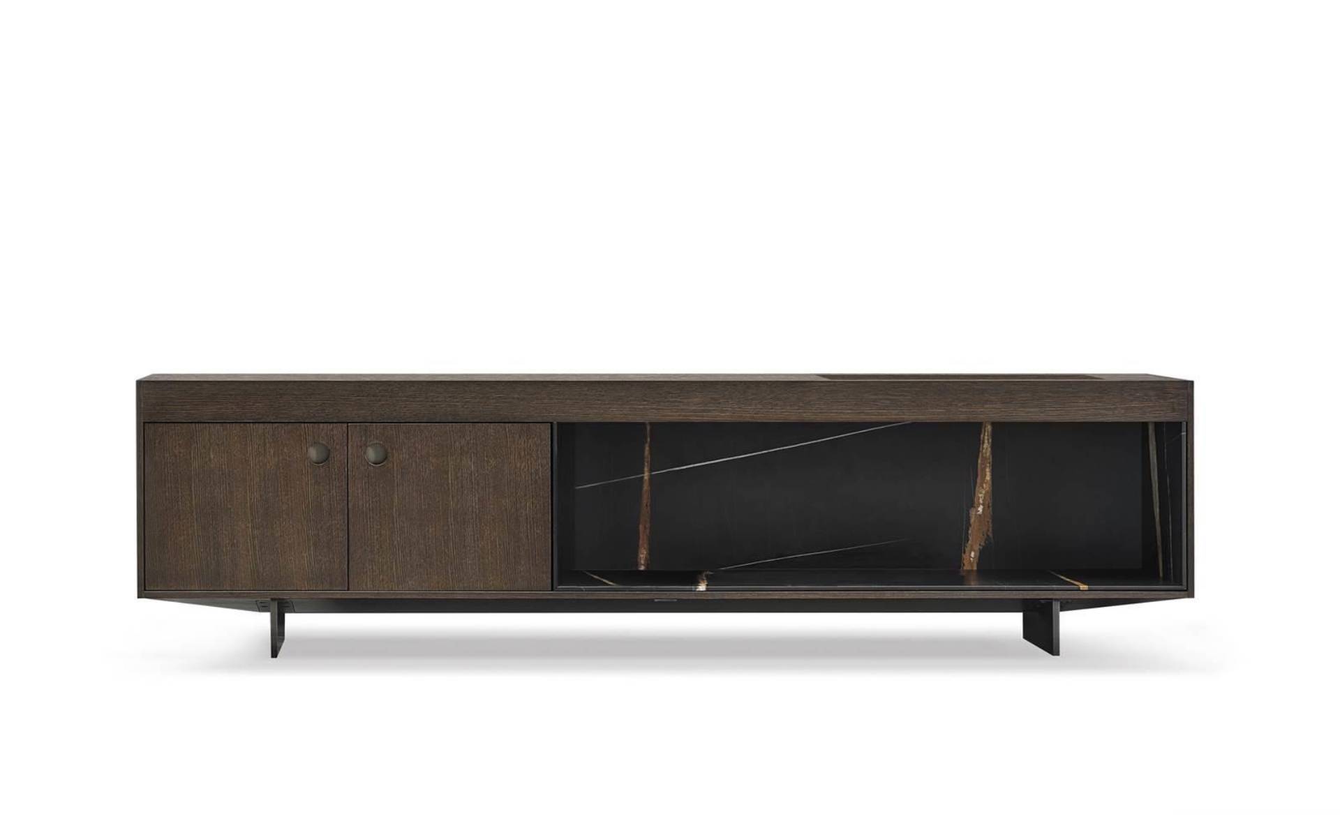 The living and dining sideboards, with one single open compartment or with closable doors, have a structure in oak with Tobacco colour stain finish or palisander Santos in matt polyester lacquer finish, and a top that accommodates a tray insert with the bottom in Sahara Noir marble, the same used on the open compartment.
