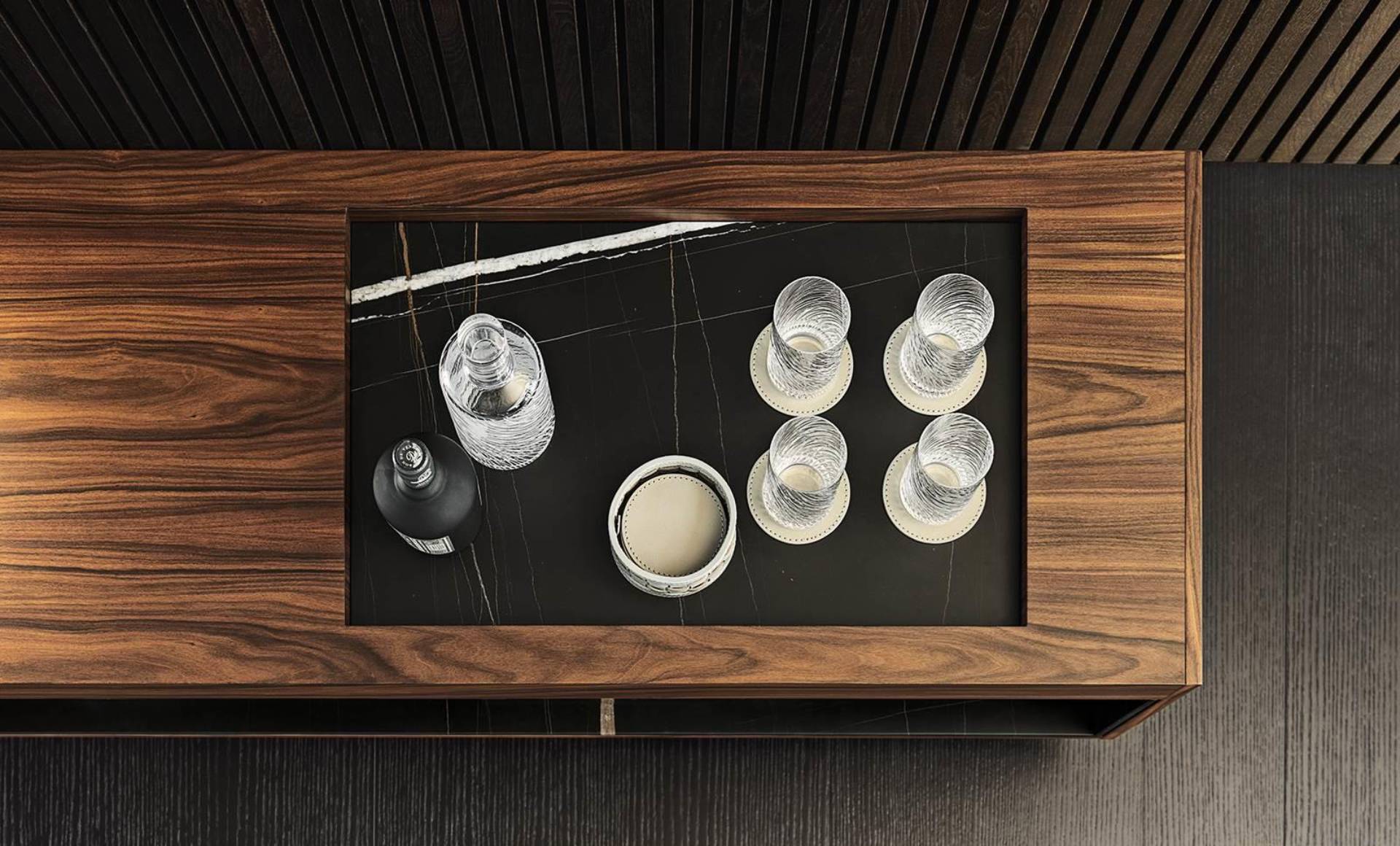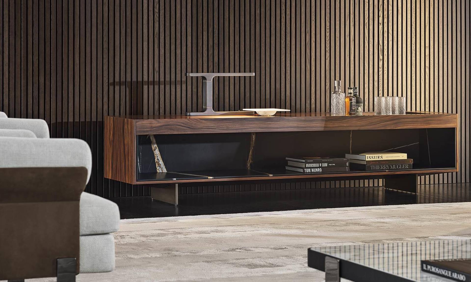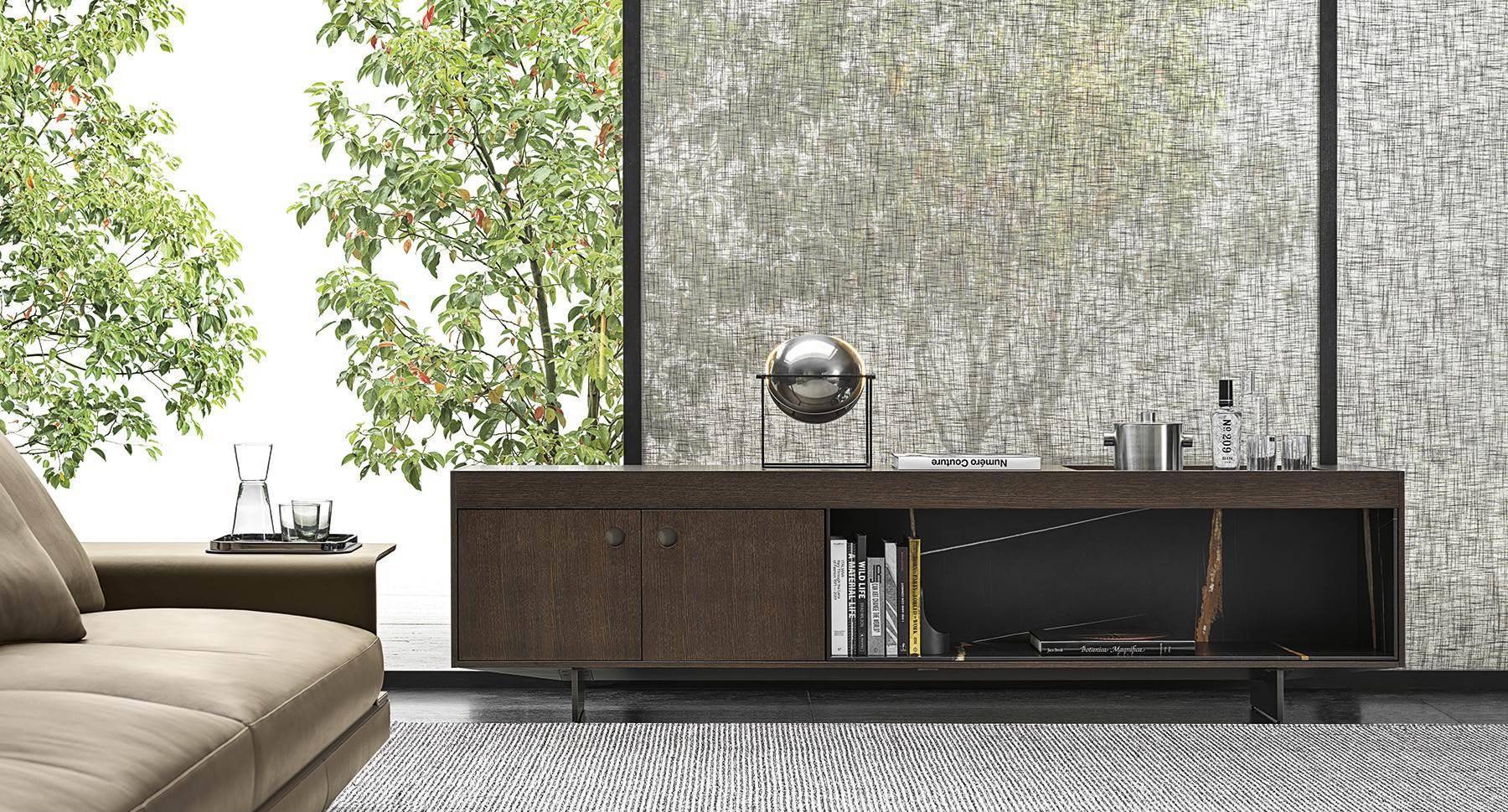 The living and dining sideboards, with one single open compartment or with closable doors, have a structure in oak with Tobacco colour stain finish or palisander Santos in matt polyester lacquer finish, and a top that accommodates a tray insert with the bottom in Sahara Noir marble, the same used on the open compartment.