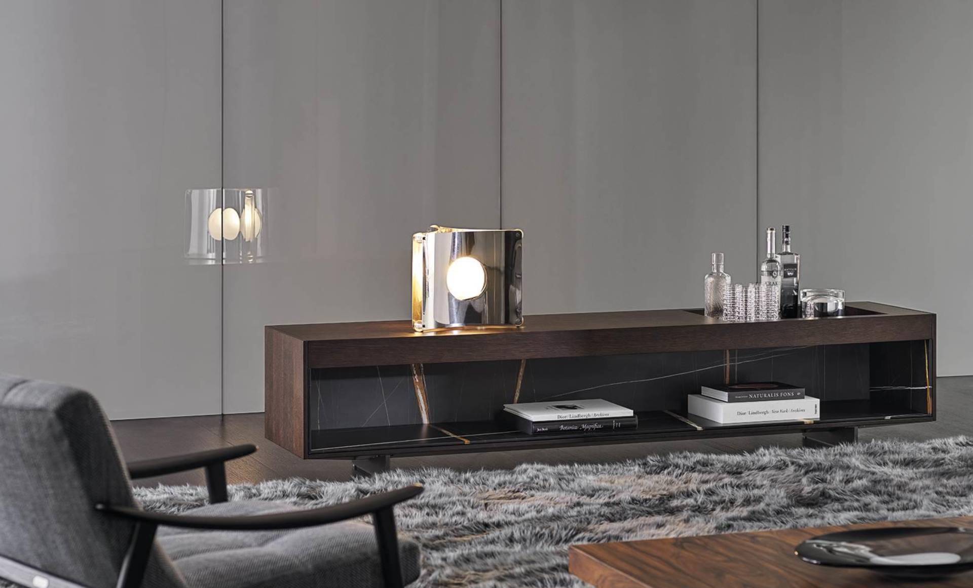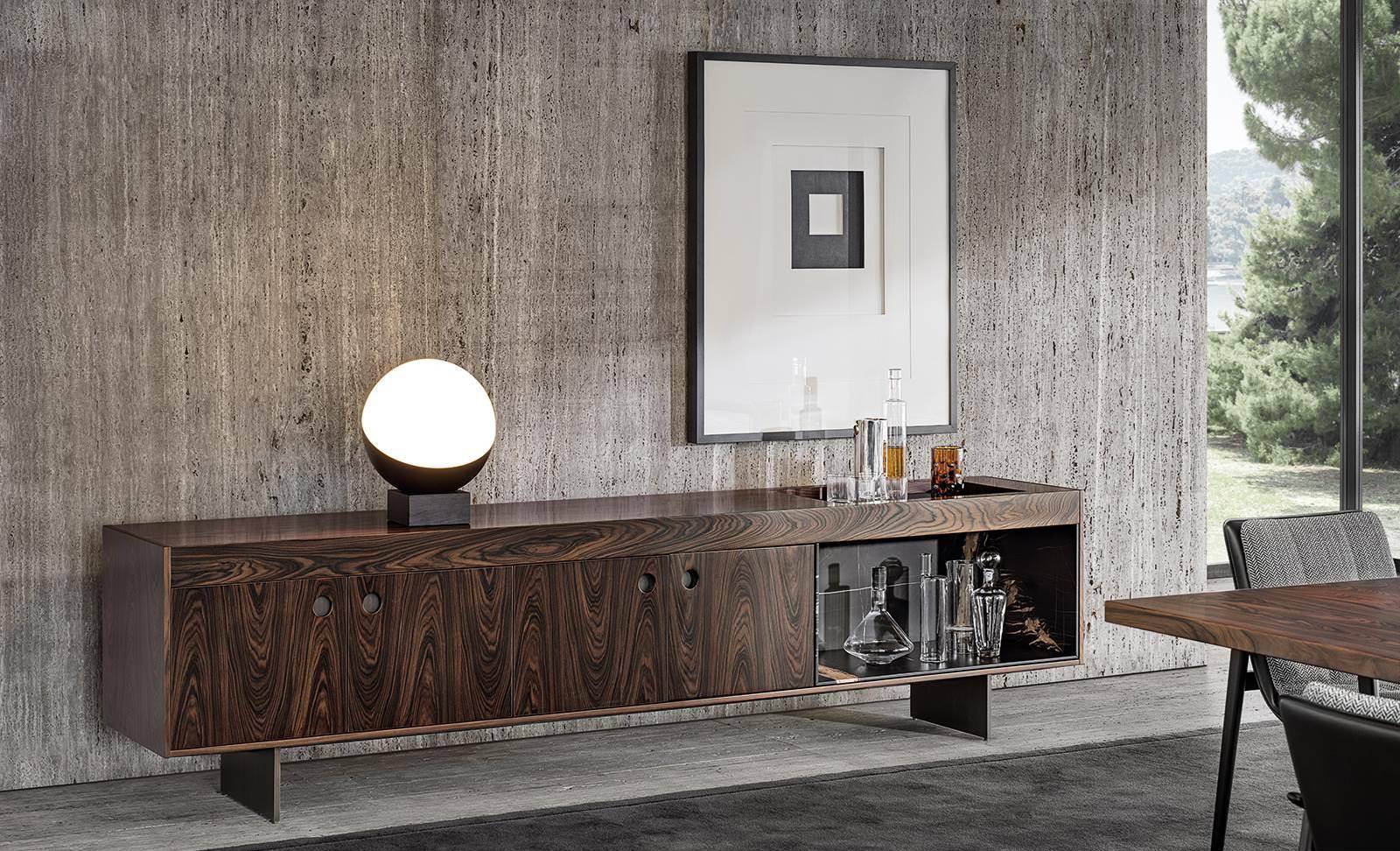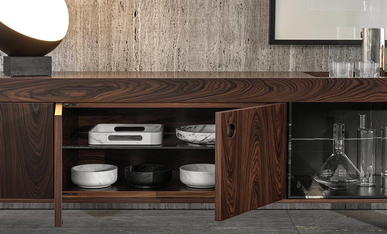 Closed spaces and open compartments define the look of the Boteco sideboards, in a carefully planned juxtaposition of materials and finishes.