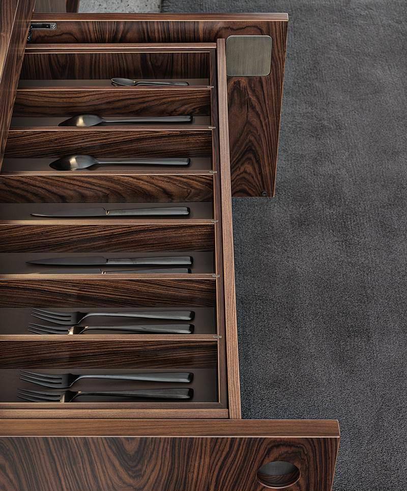 The sideboards stand on aluminium, blade-like legs with a Golden Brown finish. In the dining version, the interiors, whose finish matches the exterior one, are accessorized with a cutlery drawer and, in the sideboard with four doors, a glass shelf.