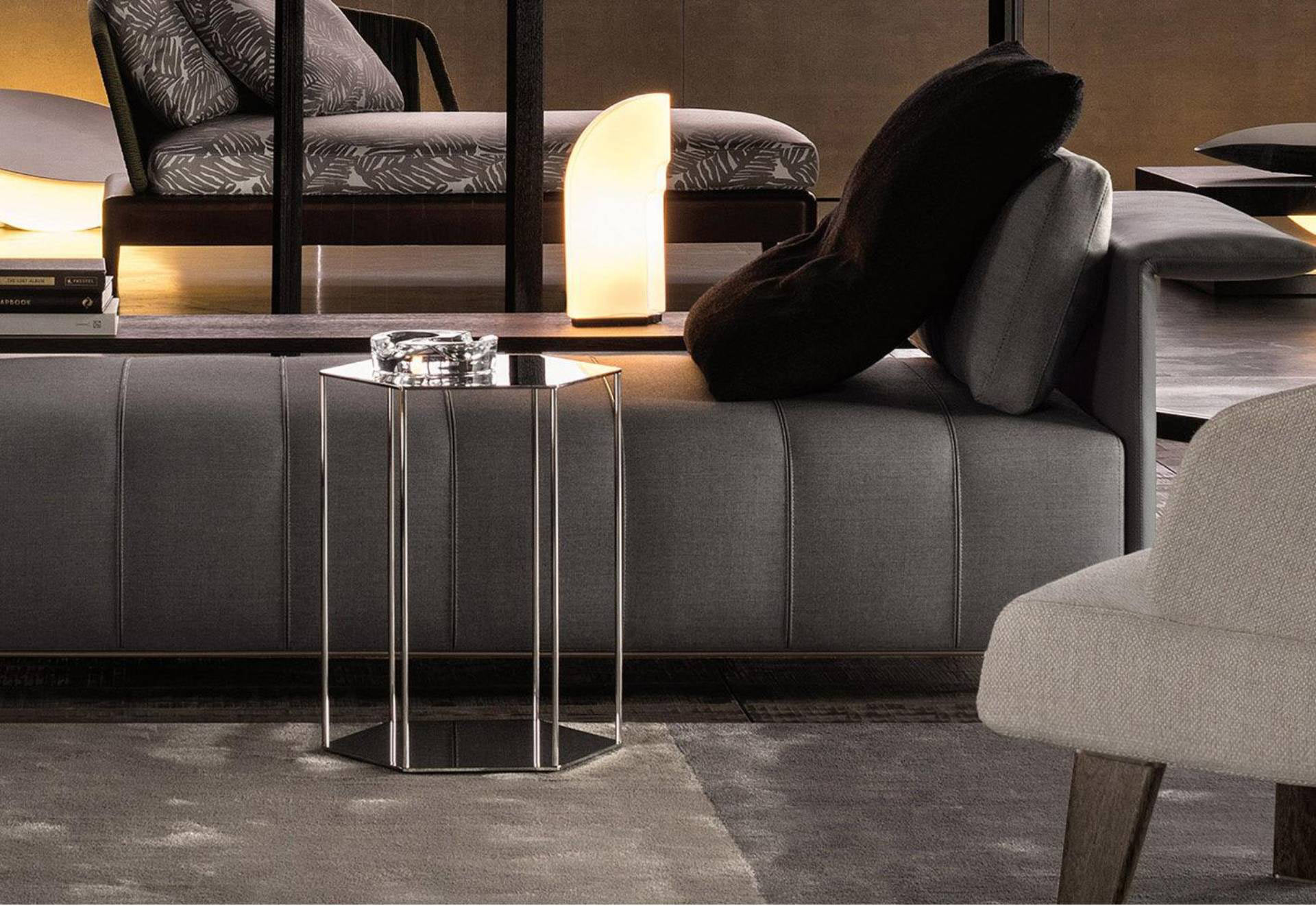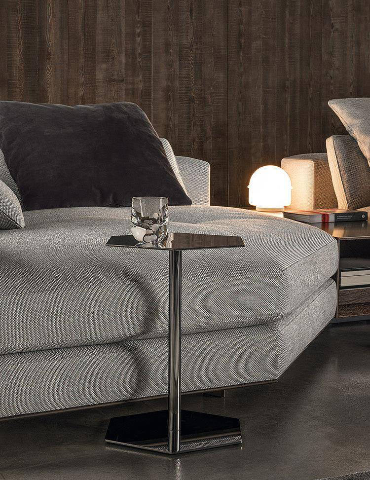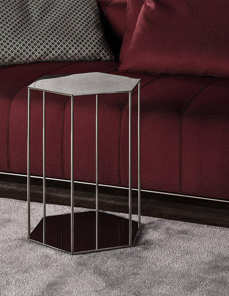 The base and top are perfectly symmetrical and revisit the hexagonal shape – one of the leitmotifs of the 2016 Collection – while the choice of chromed metal emphasizes its assertive personality. Brisley comes in two versions: with the base and top connected by slender rods or on a central chromed base. Brisley is a versatile table that can easily be paired with all the sofas and armchairs in the Minotti collection.