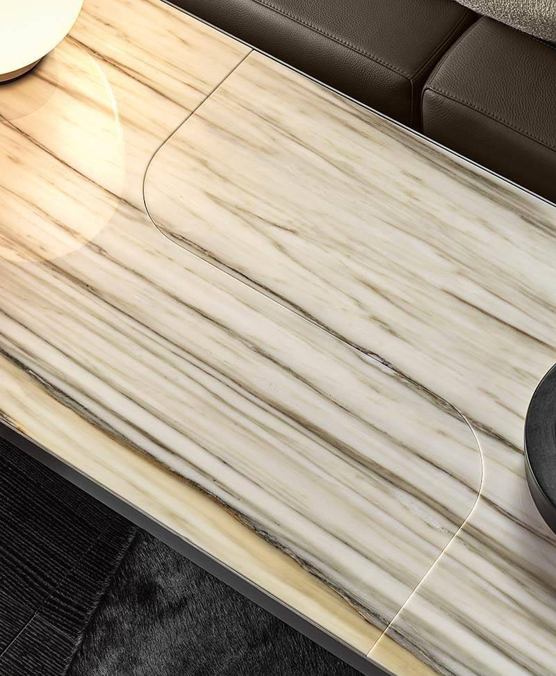 The top, available in three versions - Zebrino marble, back-painted Black or Moka lacquered brushed wenge - is embraced by a band of satin metal in Malt colour, framing it like a crown.