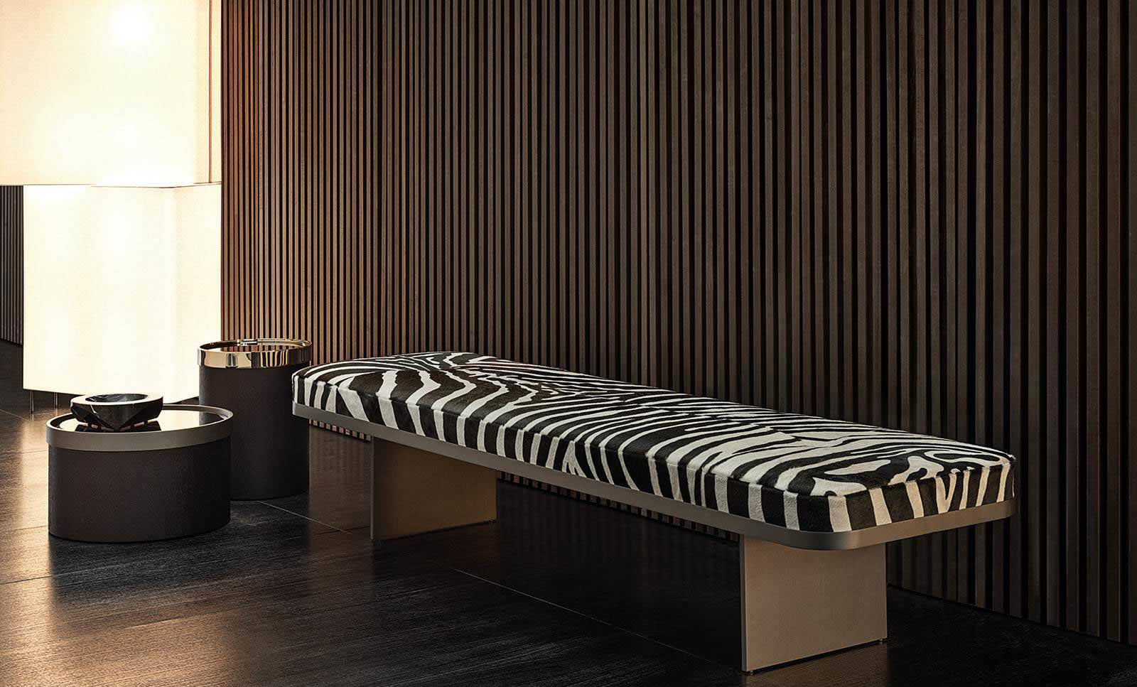 The Clive family is completed by a series of benches with padded seats, upholstered in leather or fabric, enhanced by an array of seams that underscore its fine sartorial quality.