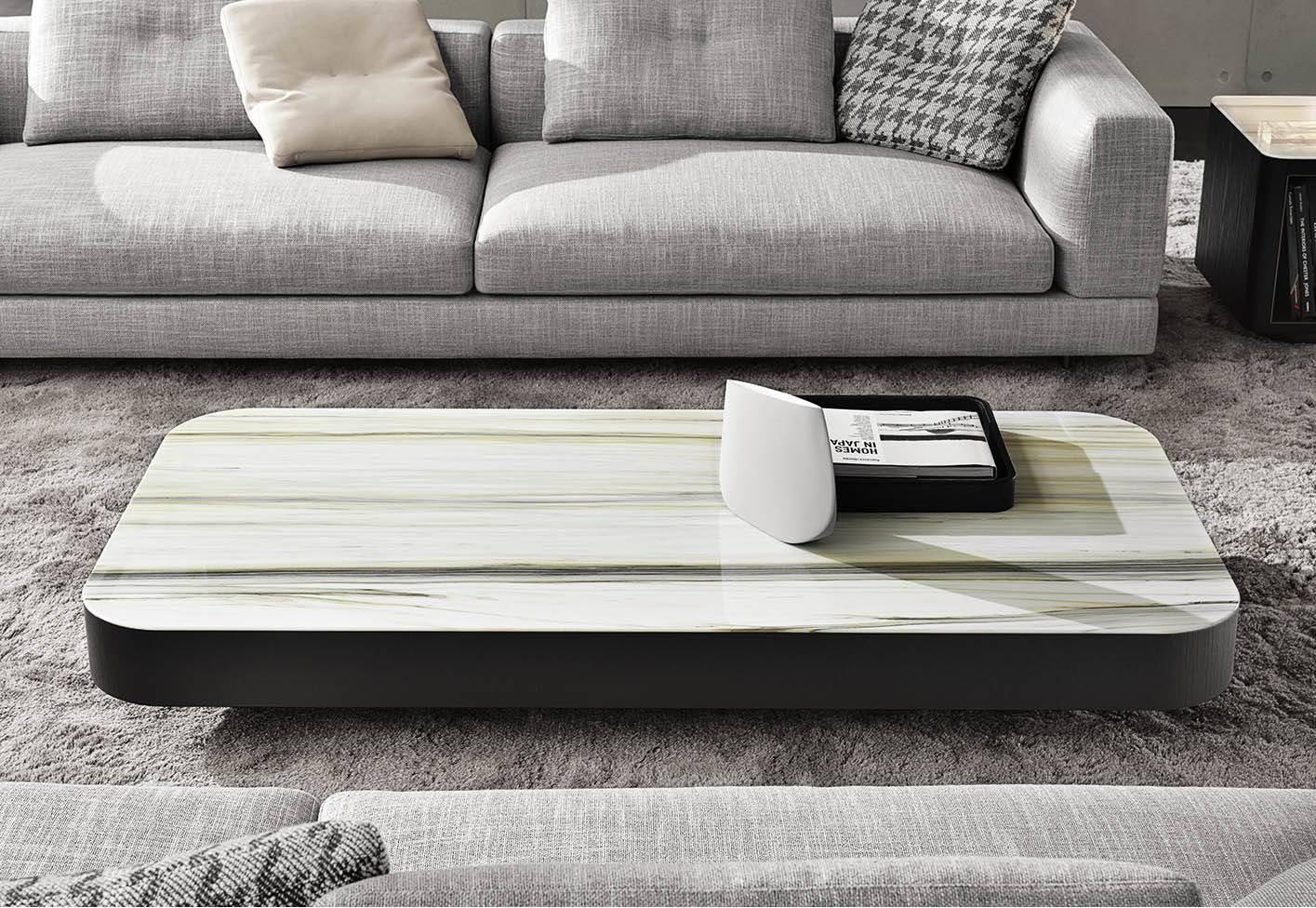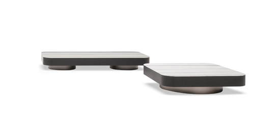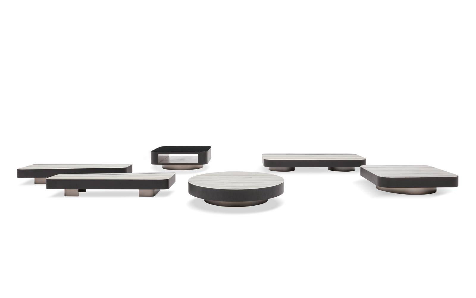 Despite the generous proportions of the tops, due to their reduced height, the tables are not invasive in the living space, but function as pleasantly decorative and functional island elements.