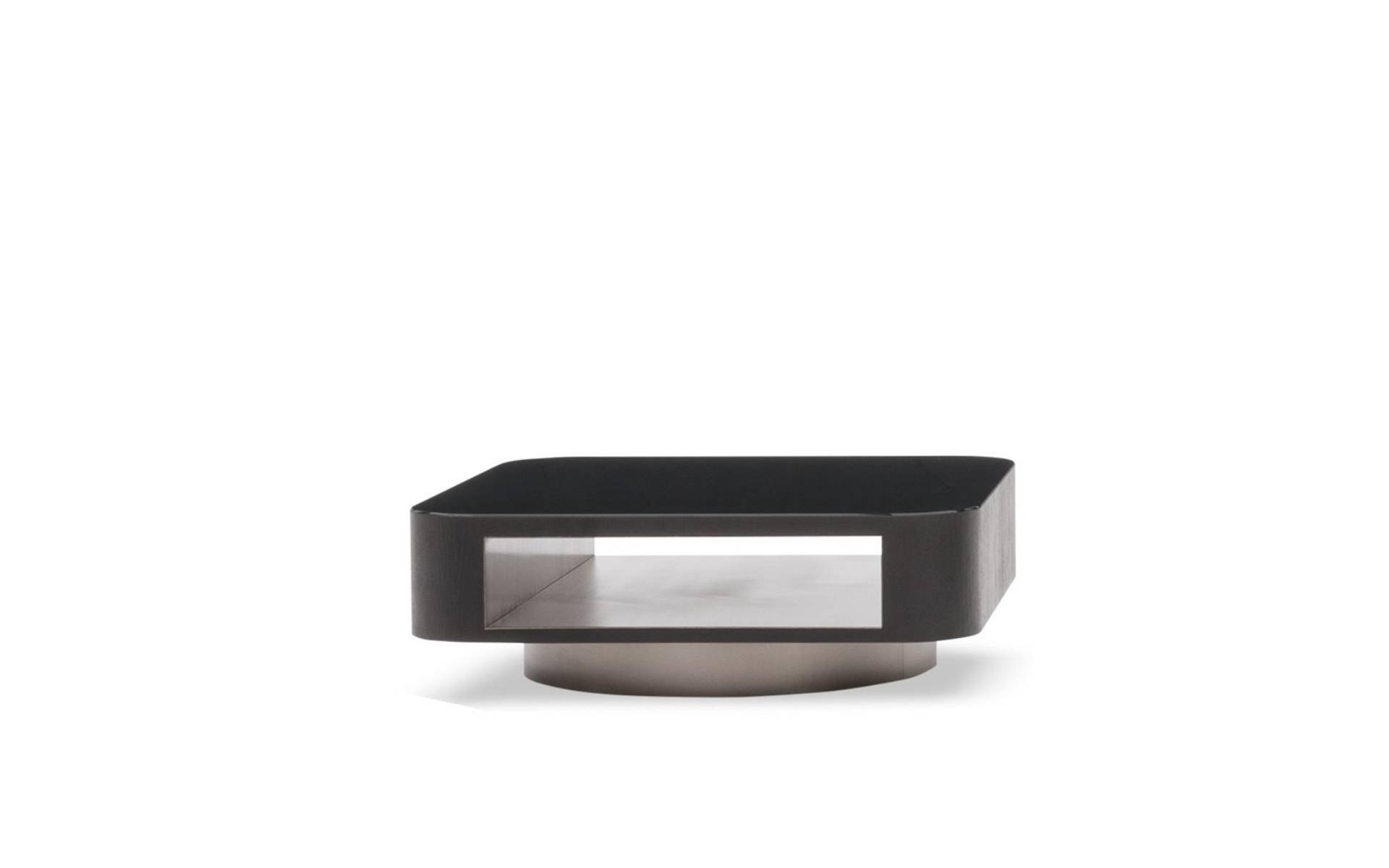 The recessed plinth in Bronze-painted satin metal transforms the supporting structure in a seemingly floating element. Closed by a band in Moka-tainted brushed oak, the frame holds the top in Zebrino marble or Black pâte de verre.