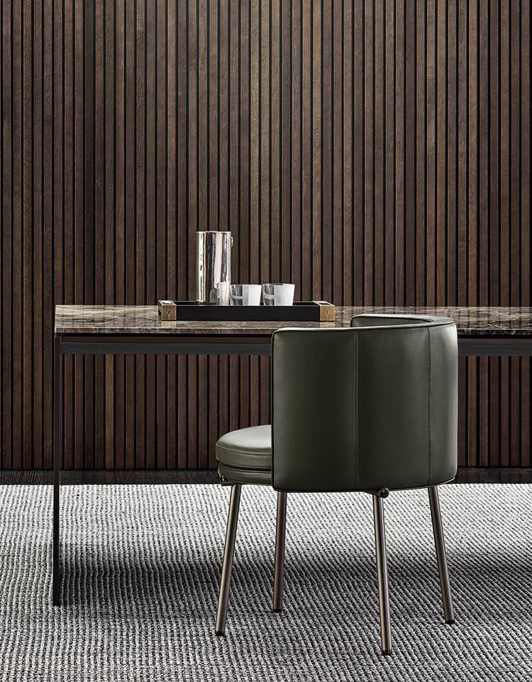 The slim backrest features vertical quilting and a piping running along the perimeter of the cushioning, underlining the couture quality of the craftsmanship. The eco-leather and eco-nubuck piping is in a slightly contrasting colour, but in the same shade as the fabric, if combined with a textile covering, whereas the leather versions come in the same shade when combined with leather upholstery. All the upholstered elements of the system can be customized by choosing the covering: 100% fabric or leather, or in fabric with a leather base.