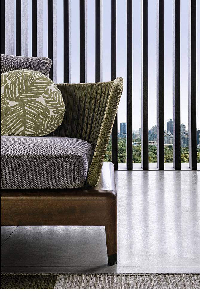 The elements are raised off the floor on Pewter color painted aluminum caps that are inserted into the wood base. The backrest and armrests are covered in a macro woven polypropylene webbing with a sleek, contemporary vibe and available in the following colors: Bamboo, Stone and Moka. The coffee table tops are in Corian® EC in the shade of Elegant Grey.