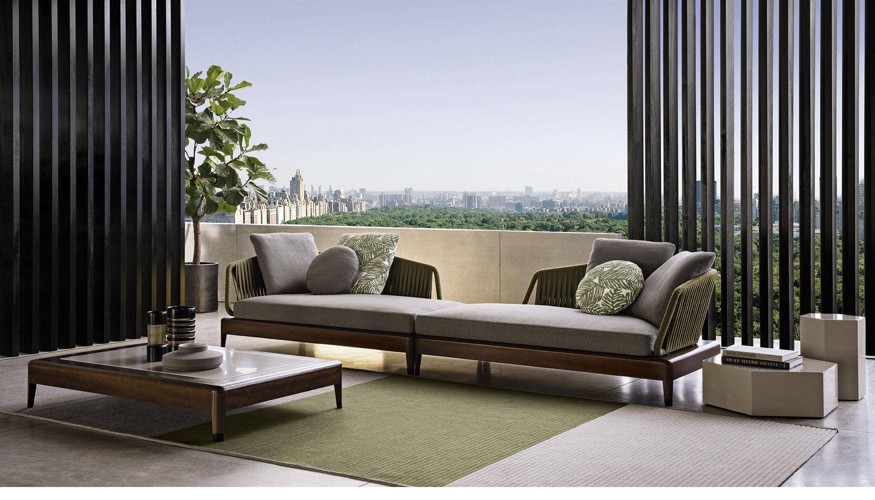 The Indiana family comprises numerous pieces - sofas, end elements, chaise-longue, ottomans, coffee tables - with their base in solid iroko, intricate hand-crafted dovetailing and finishing details, and available in both natural iroko and “Dark Brown” stained finish.