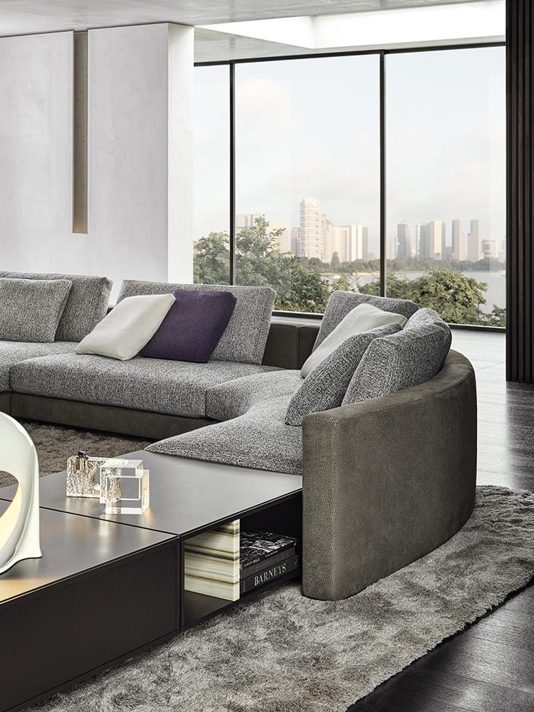 Daniels is available in two versions: all-fabric or all-leather, and in a third combined option with base and armrest in leather and cushion in fabric, flaunting a harmonious mix of the textures and colours of the exclusive Minotti textile collection.