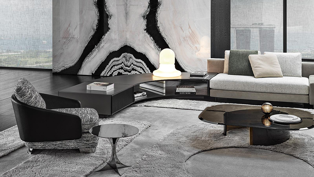 Christophe Delcourt interpreted the more decorative aspect of Minotti with the 2017 debut of the Lou collection – storage units, tables and coffee tables – the Fil Noir armchair and the Noor coffee table.