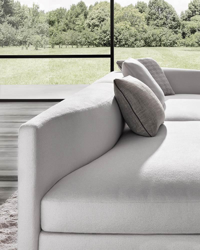 Granville is available both in the traditional sofa option and as a more flexible solution of detached islands. Joinable together, the various elements come without fixed backs and armrests and are characterized by the original curved shape of the removable armrest.