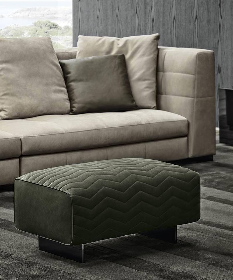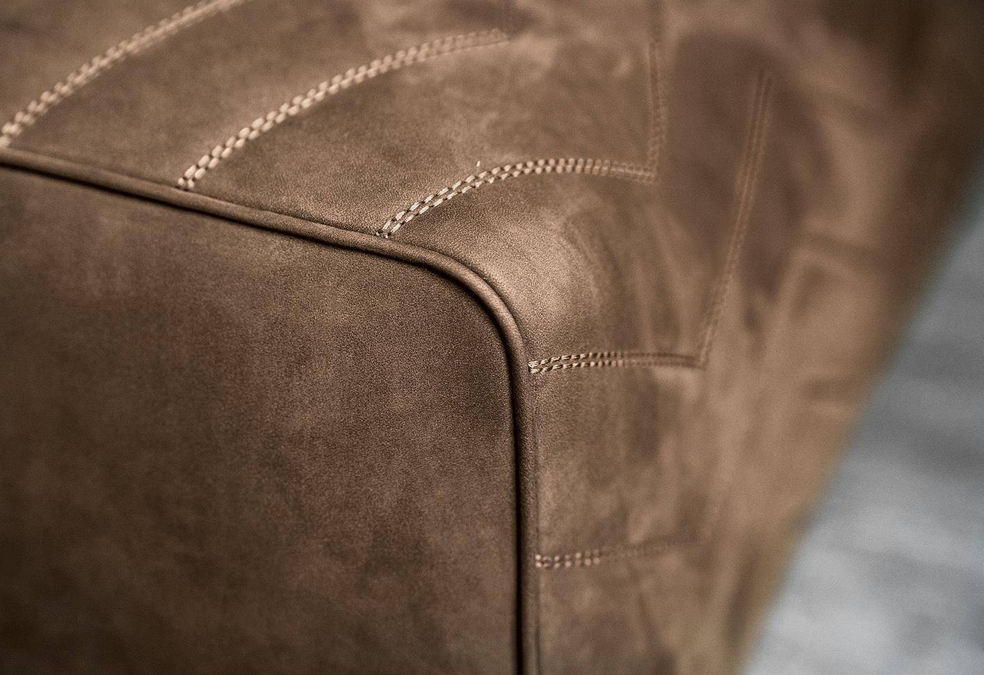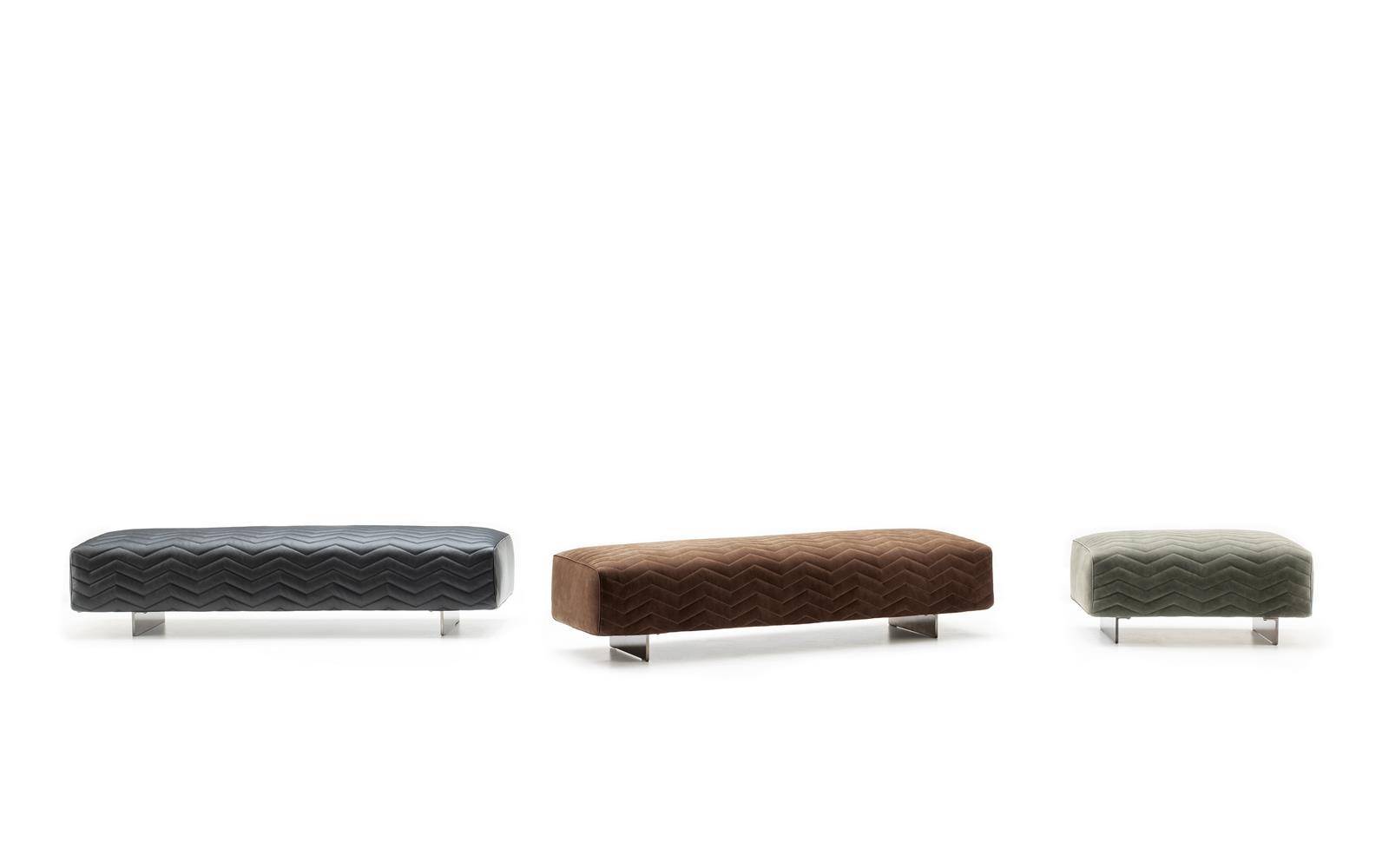 The bench is available in two versions: Quincy, covered in fabric or leather, and Quincy Chevron, only in leather with stitching. The decorative pattern, which draws a series of stitched “V”s, wraps Quincy Chevron up in an interesting three-dimensional effect, highlighting the esprit couture of sartorial craftsmanship combined with bold, linear shapes.