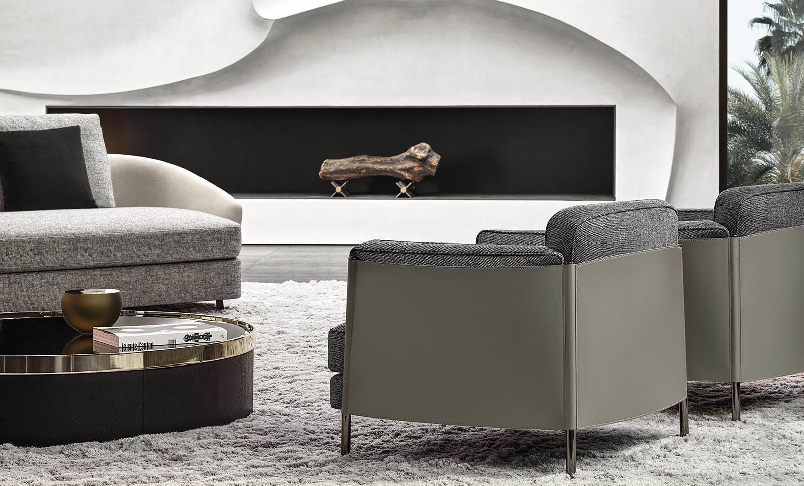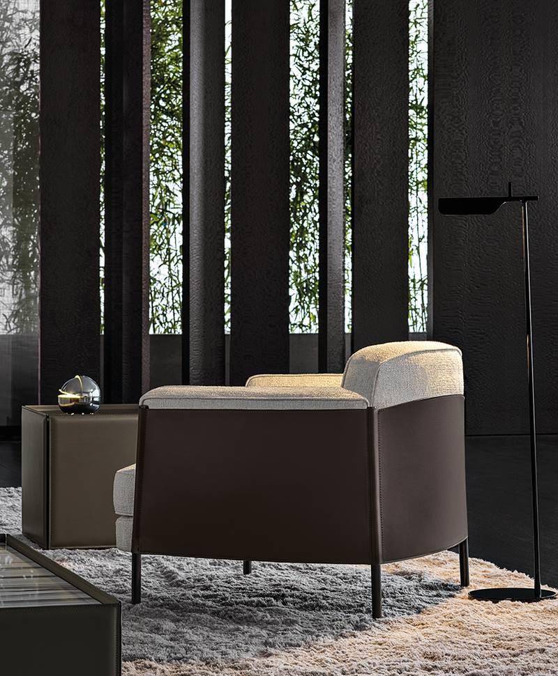The compact design concept by GamFratesi, which plays on the harmonious contrasts between a structured external shell and a soft, inviting interior, enhanced by the texture of saddle hide and the fabrics used, has been flawlessly brought to life thanks to the design know-how and sophisticated tailoring techniques that have always been the distinguishing features of Minotti.