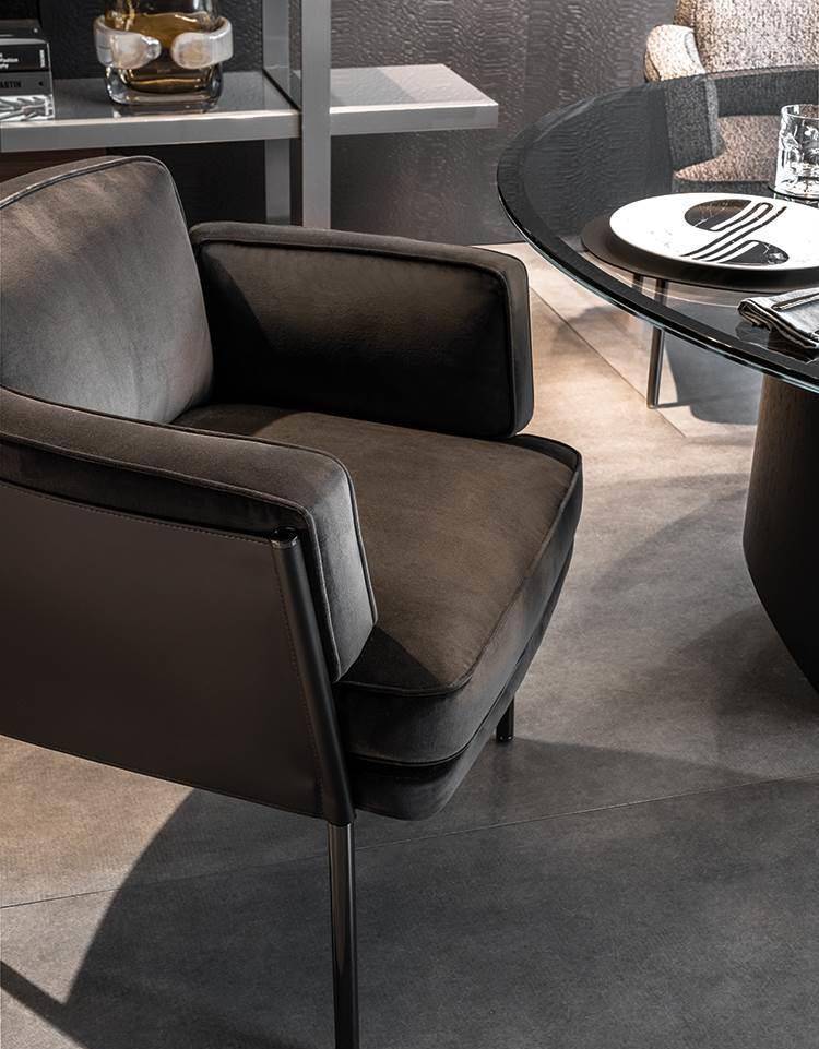 The bearing frame reveals interesting shape solutions, such as the sloping front legs, slightly open at the sides or the tightness of the saddle hide at the base of the chair, which gradually loosens in an elegant tapering effect towards the exterior of the top part. Sartorial details, such as neat piping, define the edges of the cushions, with those of the backrest and armrest designed as three separate elements.