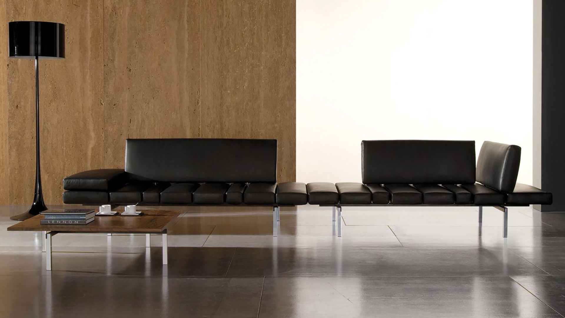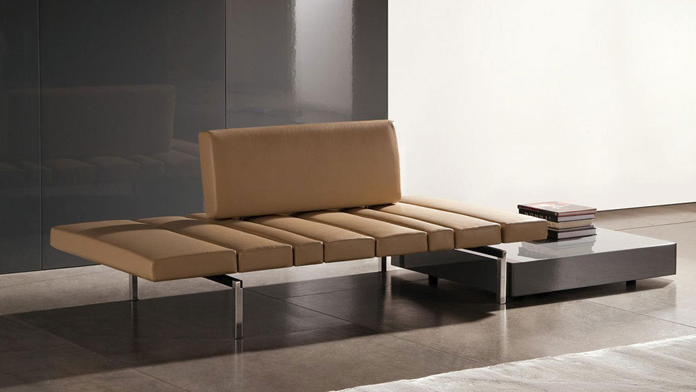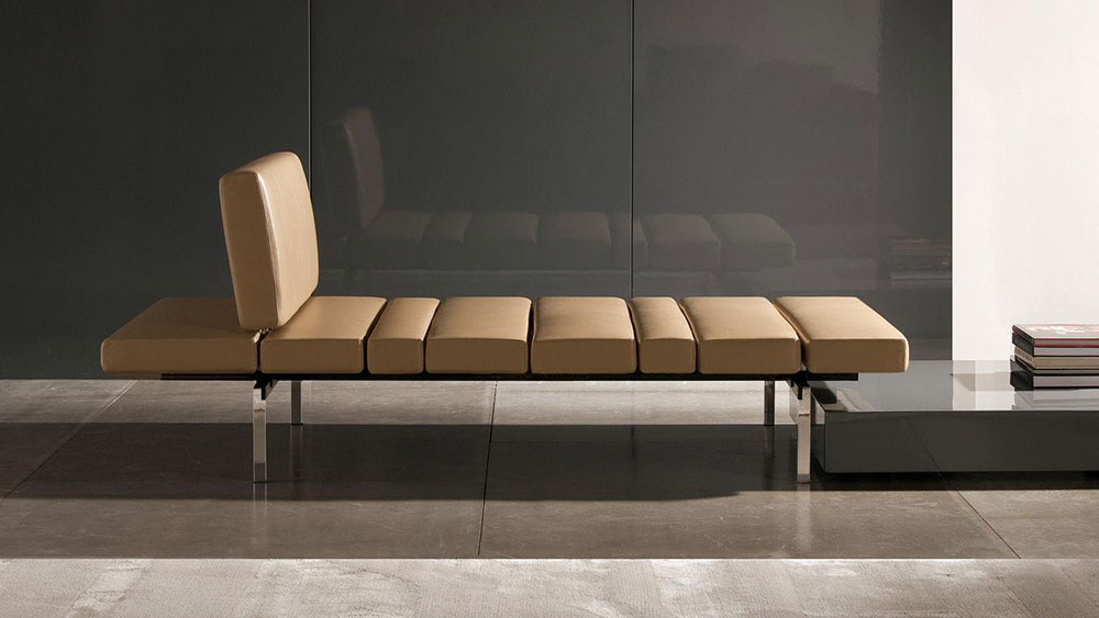 It can be optionally supplied with armrest or decorative cushions. A few connecting coffee tables – made from either walnut or brushed porphyry – are available, thus resulting in unparalleled versatility and flexibility.