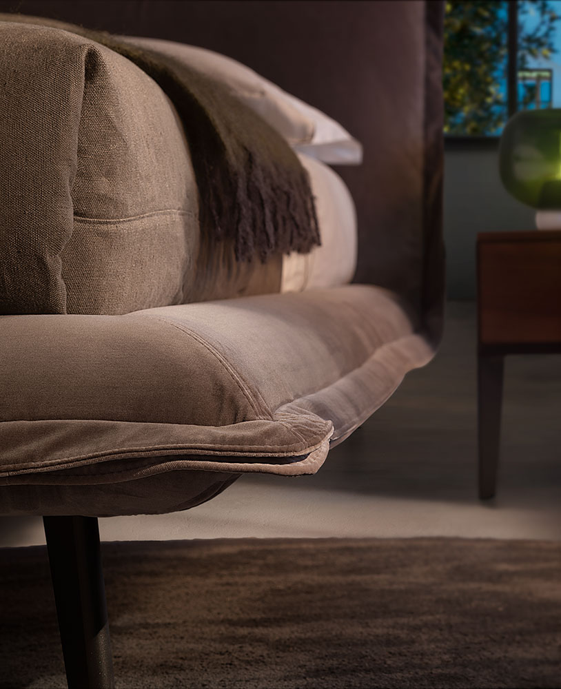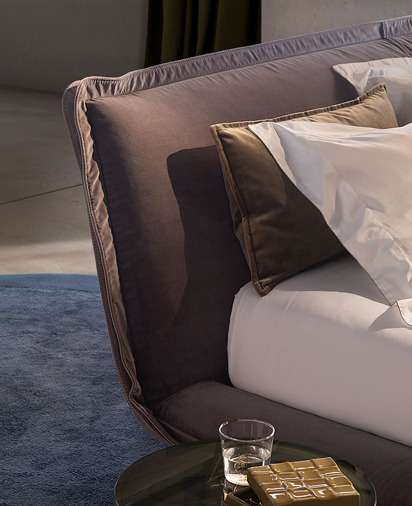 The wonderful softness of the Piuma bed can be perceived at first glance. Looking at the headboard, it is easy to imagine two pillows joined together providing ultimate comfort. The graceful contour of the bed is highlighted by an original detail: the ruffle that runs all around it.