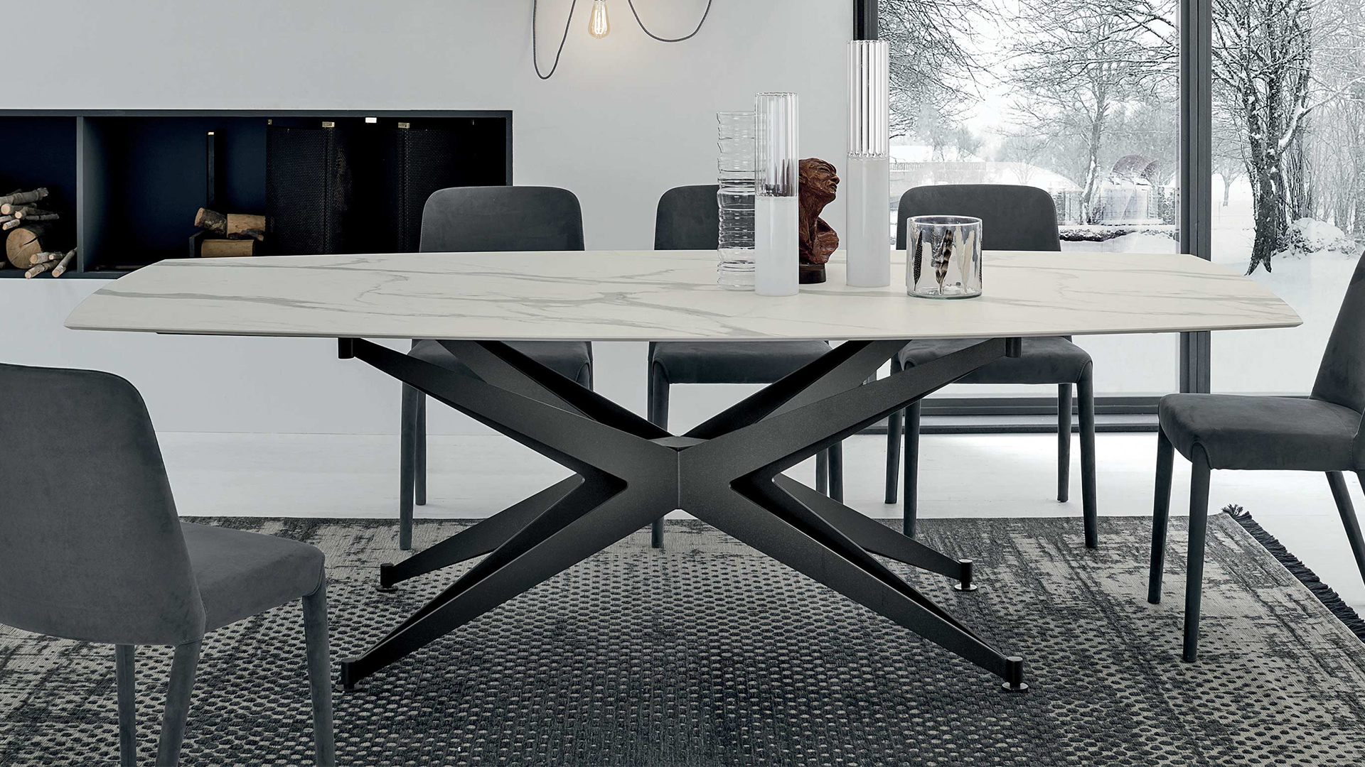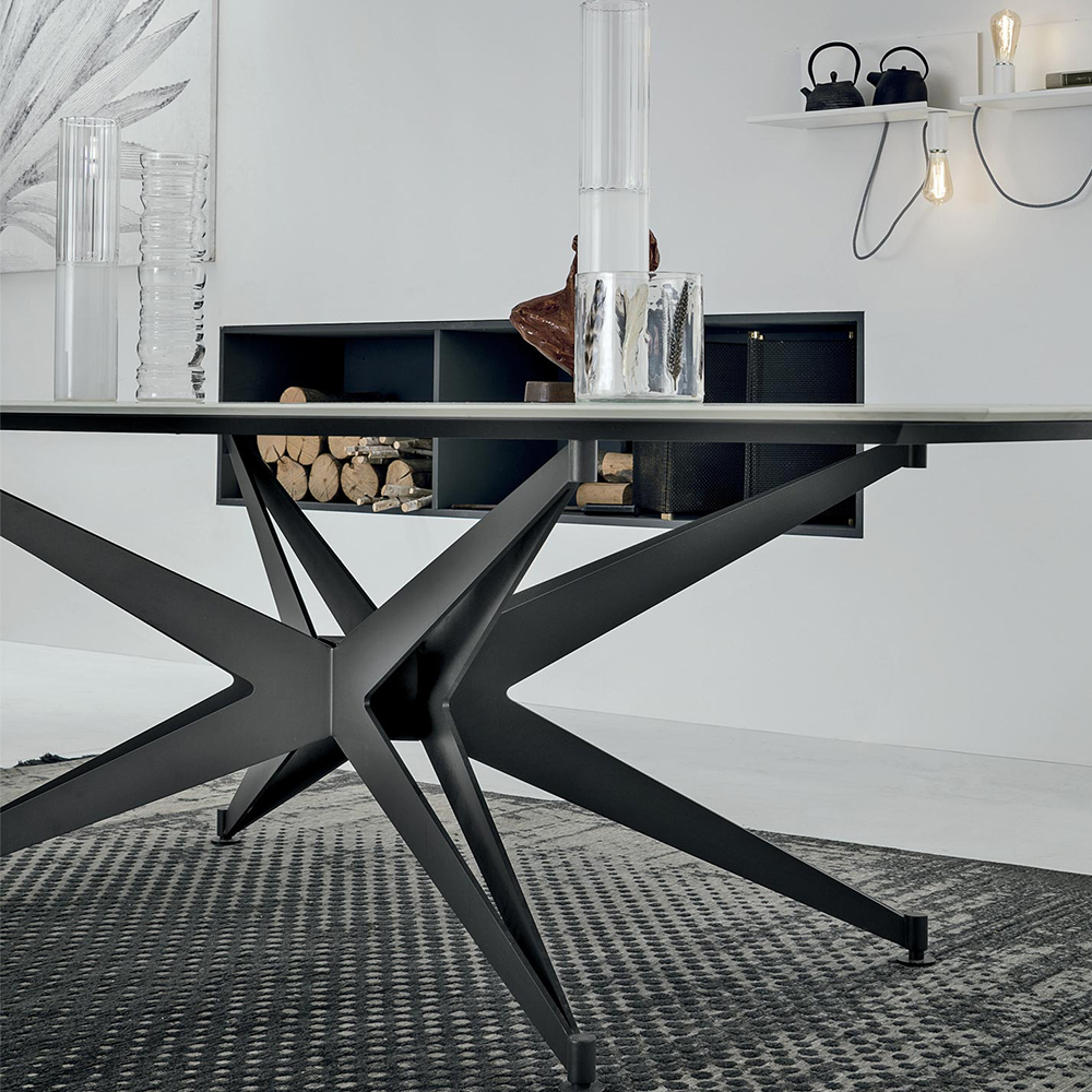 A sculptural table with a solid, star-shaped base that supports the light, plate glass top. A perfect balance of materials and aesthetics.