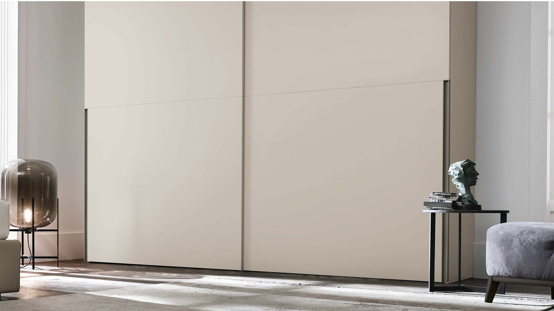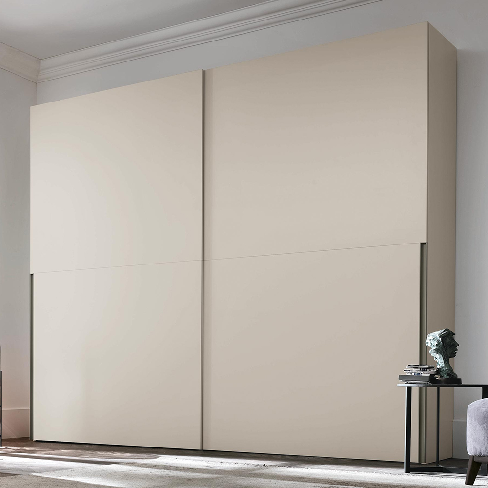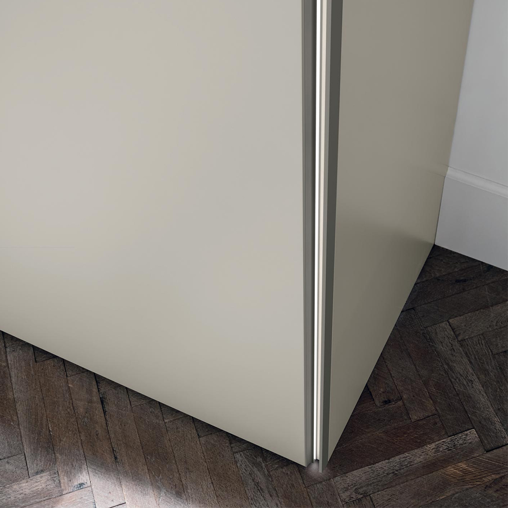 The metal handle integrated in the door divides the wardrobe`s height in two. A decorative feature is also a very practical detail that makes it easier to grasp and slide the Doris door. The integrated handle is available with optional light.