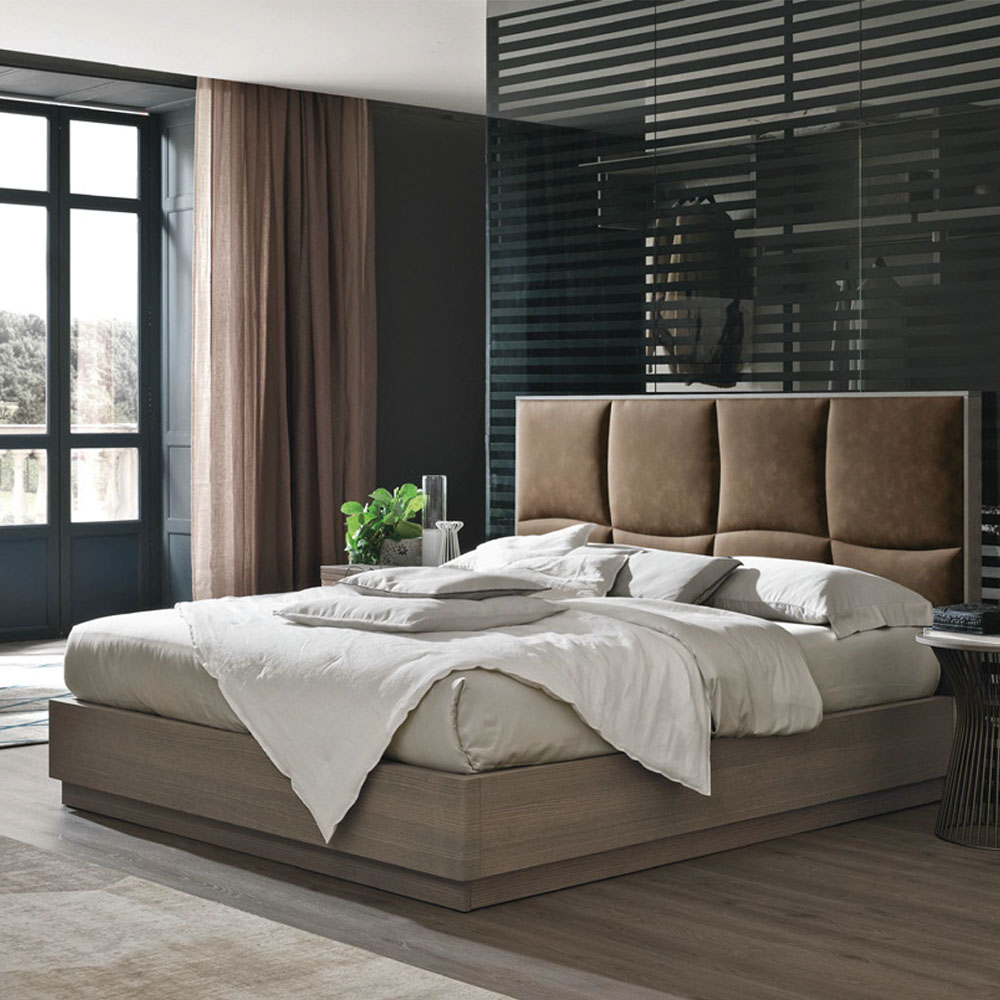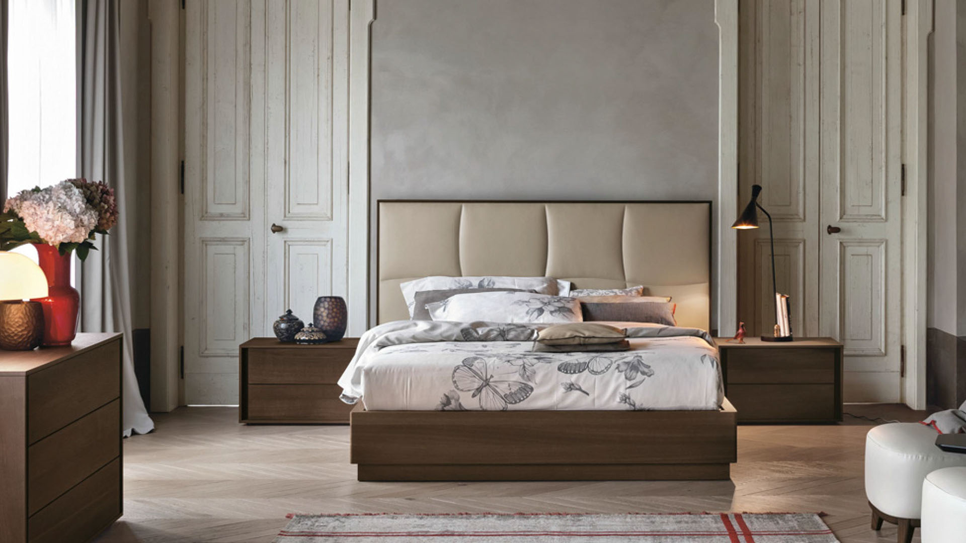 Wood frames the prized leather, eco-leather or eco-nubuck headboard cover whilst the stitching sets off the design of the padding. The materials harmonize with each other making the bed the quintessence of style and refinement.