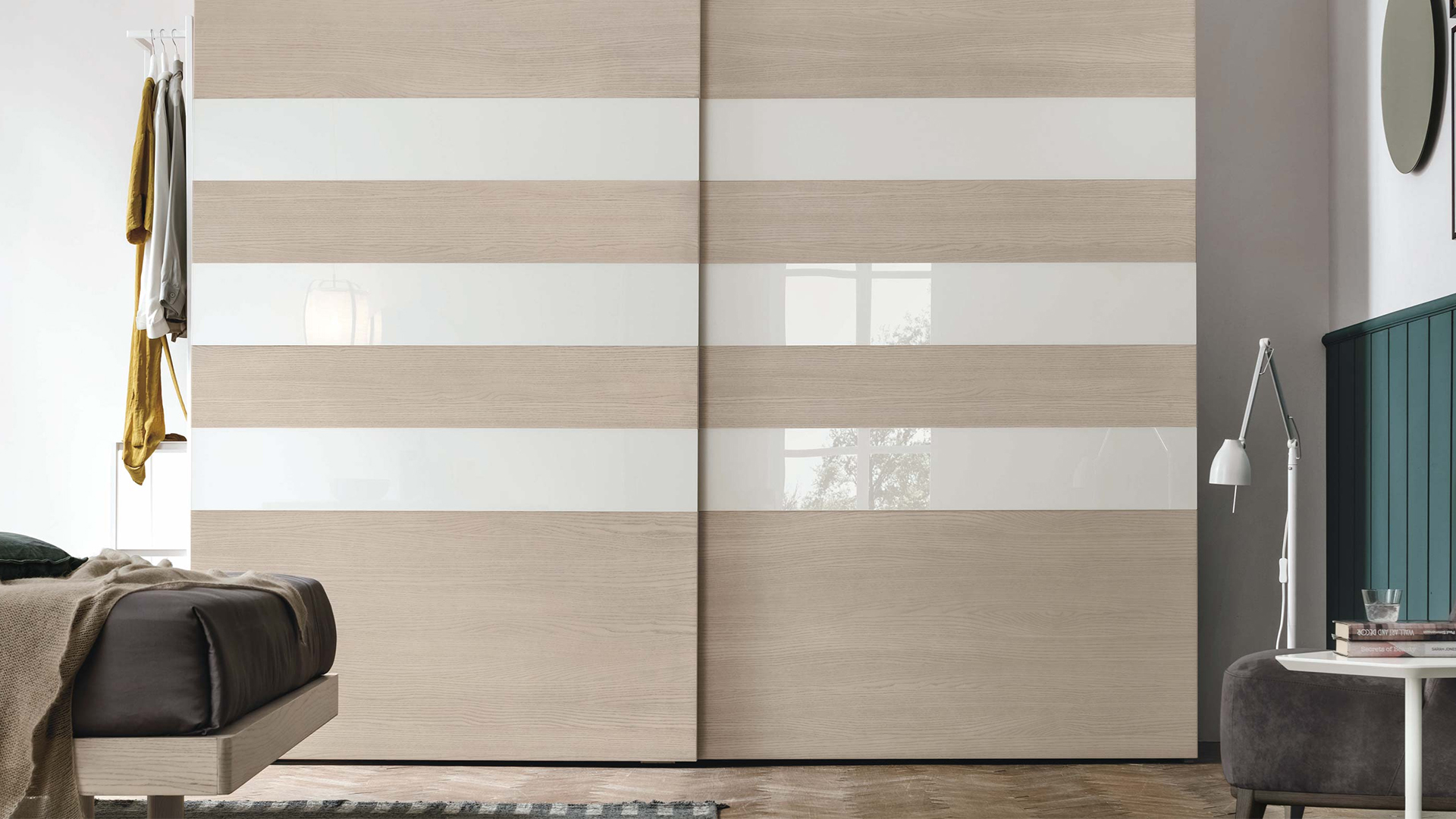 The Step 3 door features great versatility, allowing you to create contrasts in colours and materials, making the wardrobe the true protagonist. A single surface is only broken by a horizontal glass panel and a vertical groove that hosts a grip-recess handle in the thick edge of the door: a practical and convenient gap that makes opening and closing movements easier.