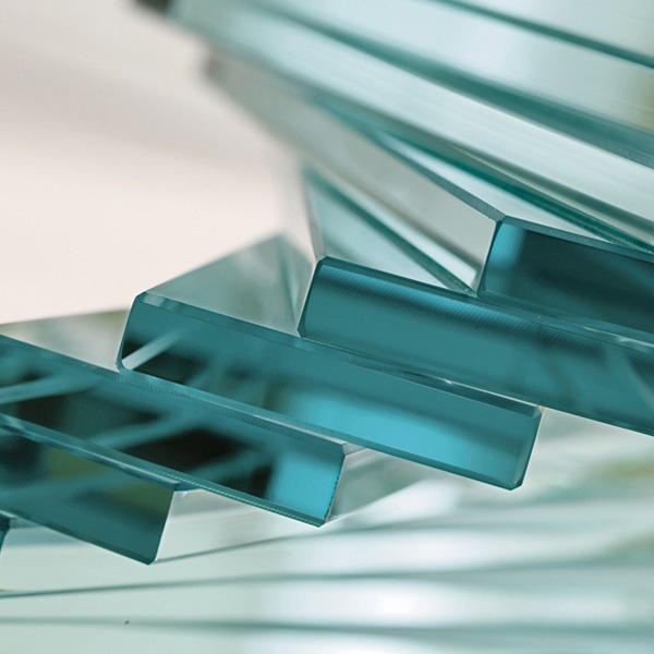 A spiral developing upwards, made of thin glass bricks that provide light refraction, playing with colors and reflections.