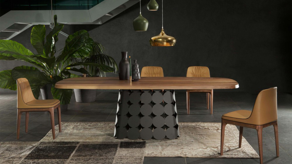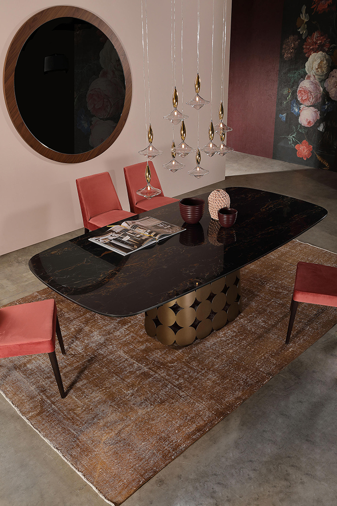 POIS fully represents the natural inspiration Tonin Casa got for its “Jungle” collection: lights and shadows play with the base, in the same way sunrays penetrate the leaves of the undergrowth. The base’s coloring – white, carbon grey, or matt gold – either enhances or smoothens such lighting effect, to match the tops various finishes.