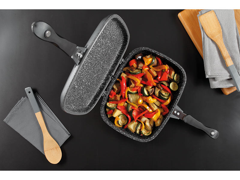 The Sphera Rectangular Double Sided Pan is therefore suitable for all cooking surfaces and also allows healthy and healthy cooking as it is nickel and PFOA free. The Soft Touch bakelite handle has an elegant, refined and patented design.