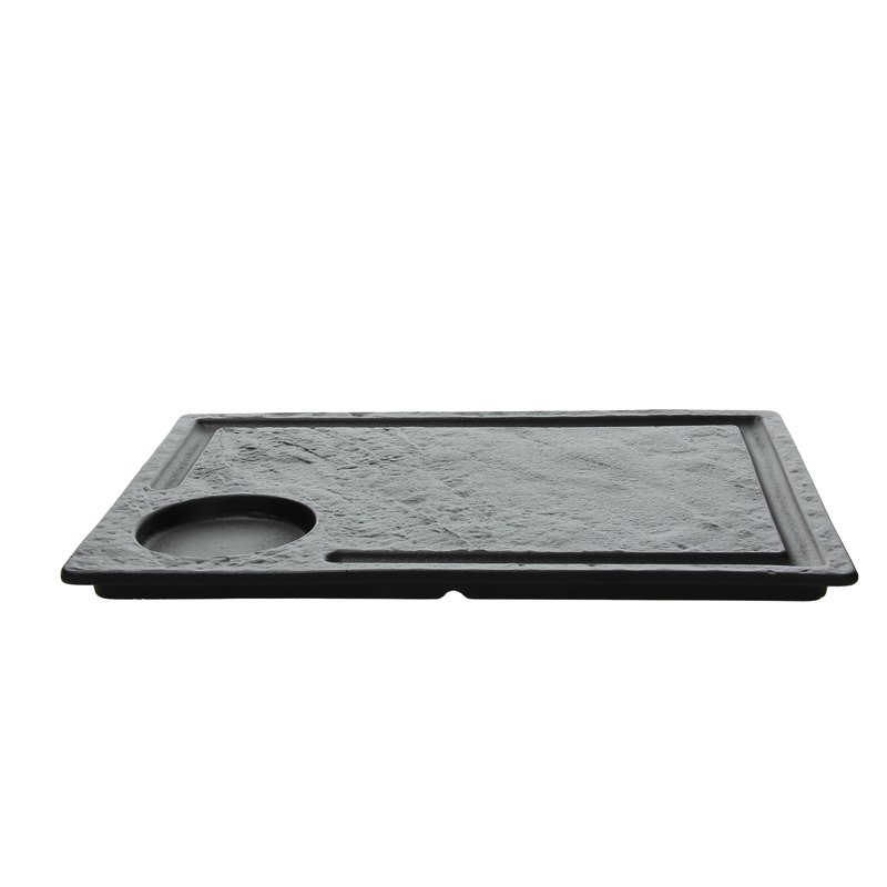 The plate of the Vulcania Black line is made of black paste porcelain with a lava stone finish. It is also highly resistant to time and damage.