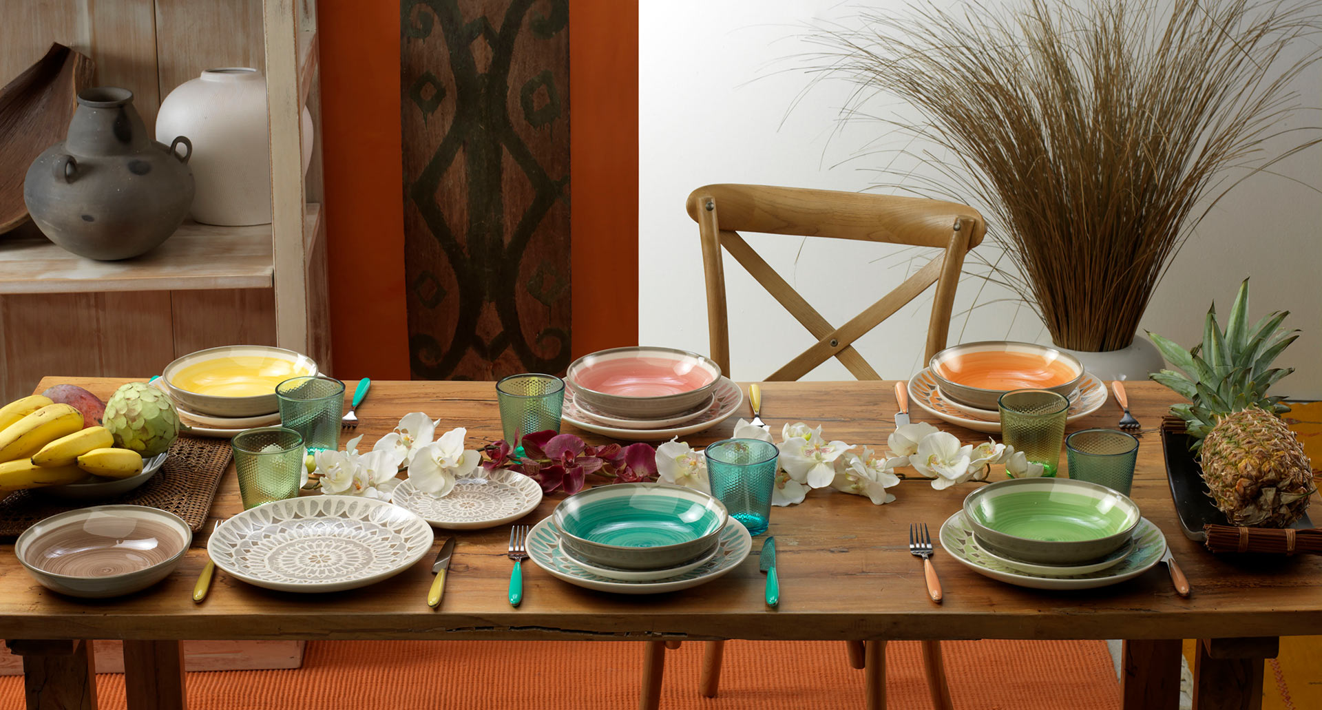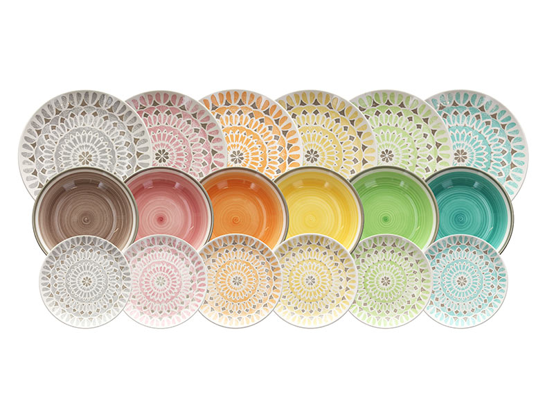 The Capetown table service is made of ceramic and has a trendy and eye-catching style thanks to the explosive number of colors and patterns present on each plate. Bright, colourful, functional, modern and stunningly lively, they challenge boring design and all black and white traditional tableware.