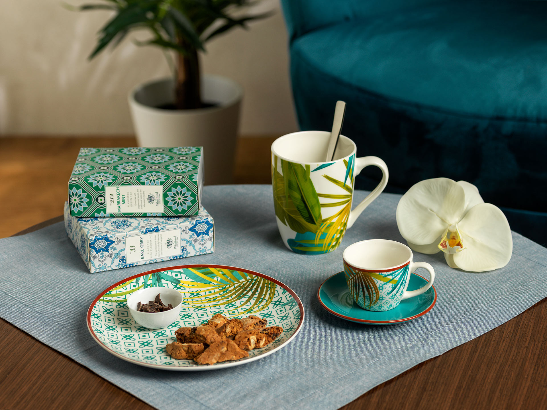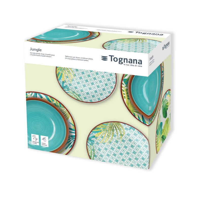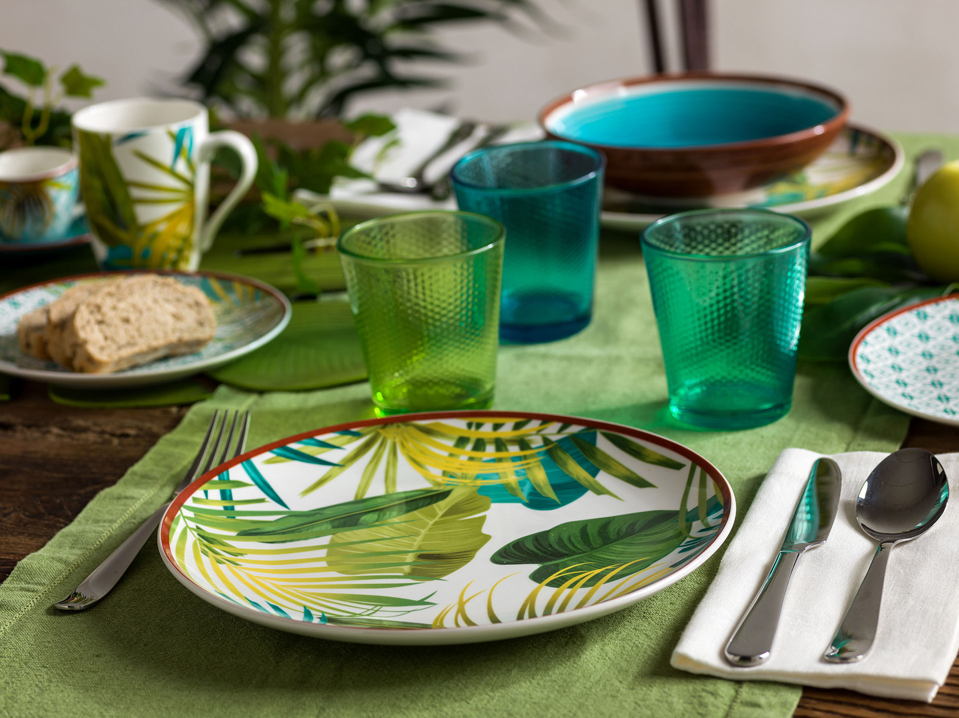 The Jungle table set is made from a combination of fine porcelain and ceramics, with a tropical floral pattern on the dinner plate, a turquoise geometric pattern on the dessert plate, and a soup plate hand-decorated in aquamarine.