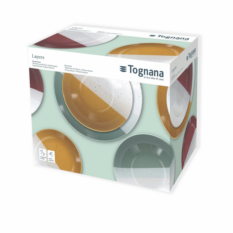 The dinner service of the Layers line has an original pattern: it directs the geometric display of color in three alternatives.