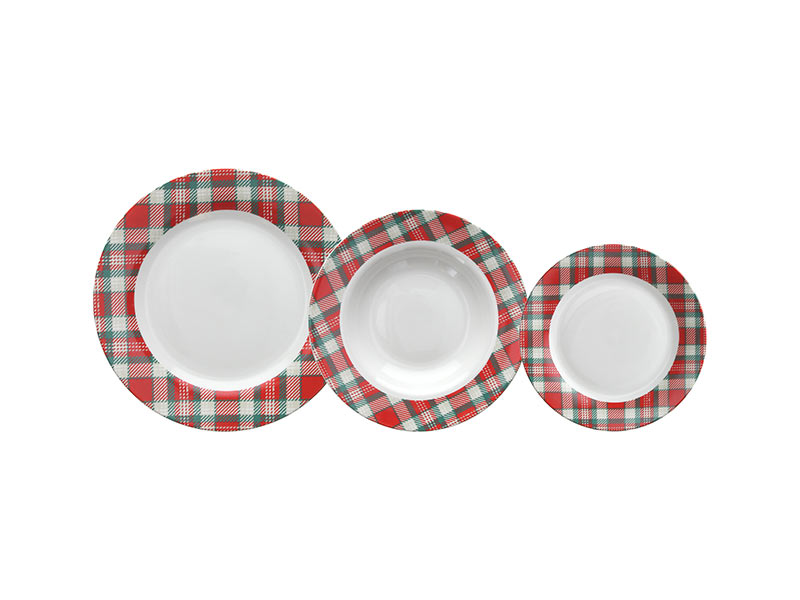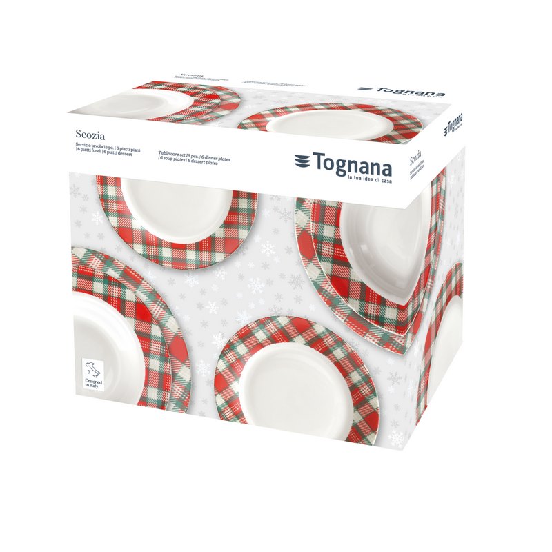 The Scozia table service is made of white porcelain with a classic red and green tartan decor. It is an indispensable accessory for your Christmas table in traditional colors and tones of the holidays.