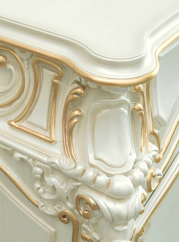 The set is made in a classic design. The main material is solid wood and fine wood veneer coated with non-toxic white lacquer. Furniture is hand carved and painted. The chairs are upholstered in luxury black textiles.