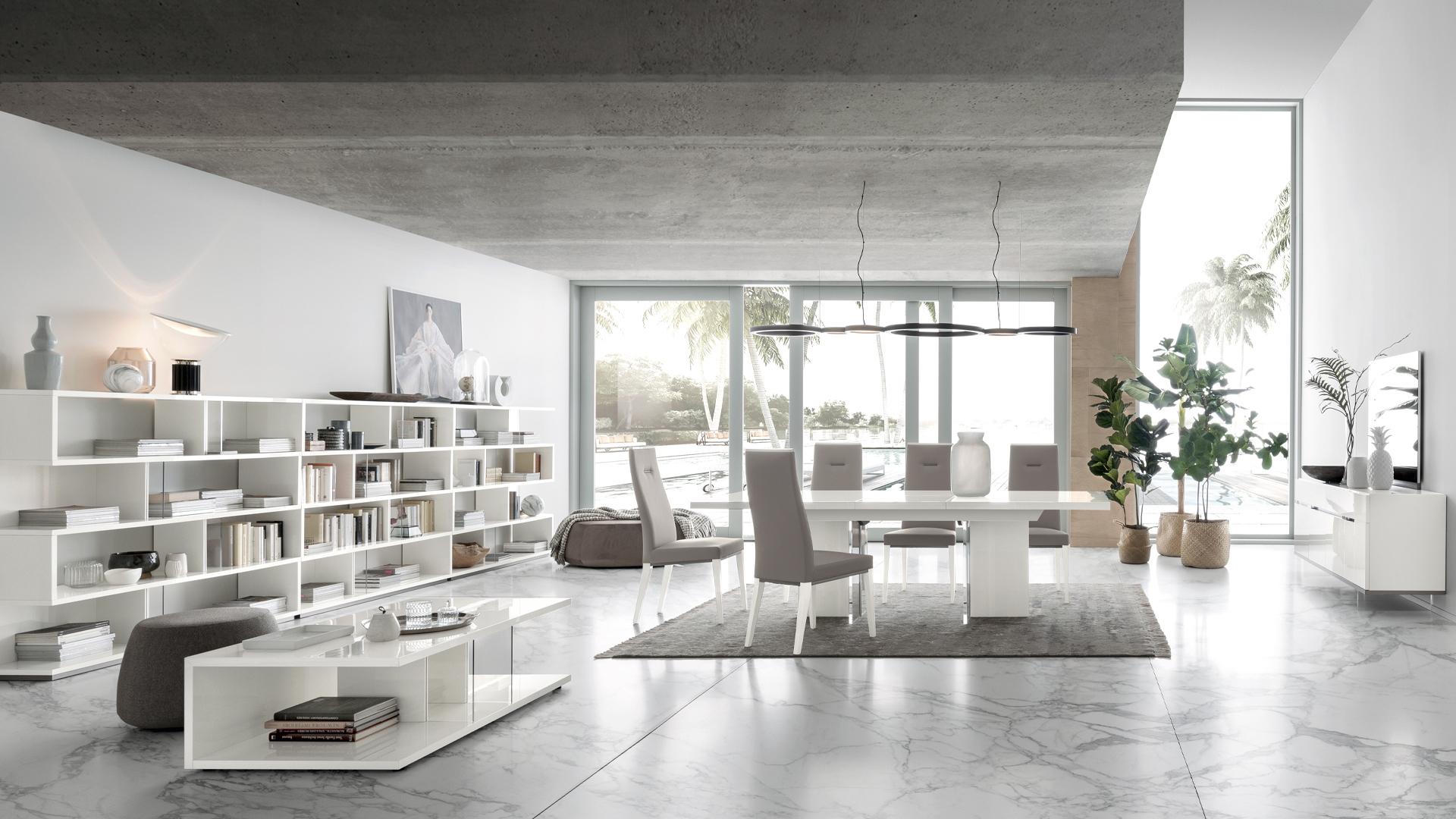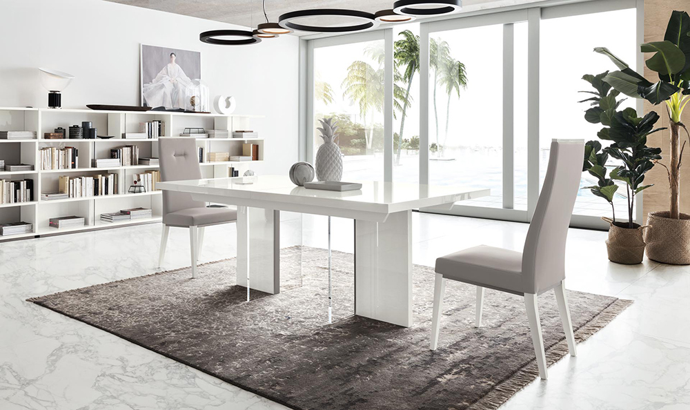 Artemide dining table is extendable and available in two sizes. The chairs feature an eco-leather upholstery seat and back that is super easy to clean.