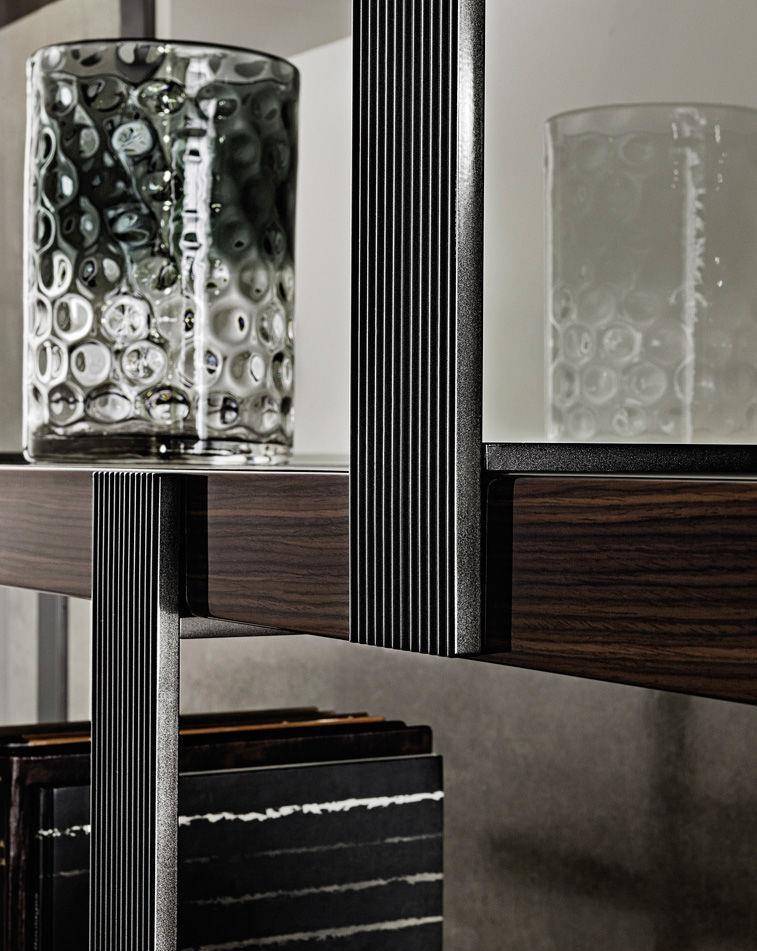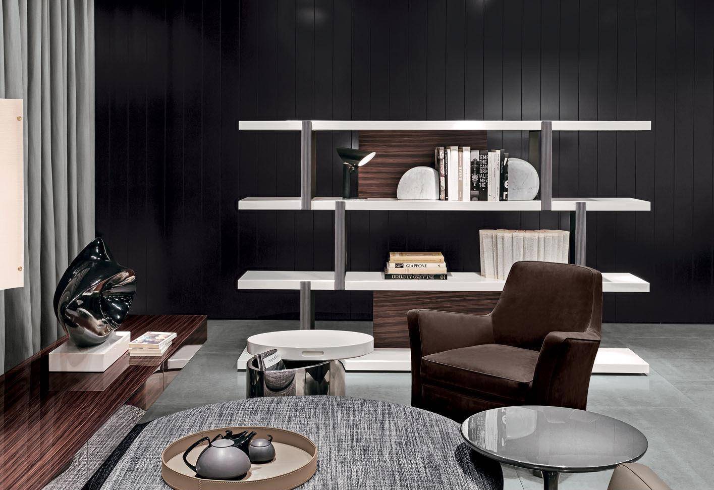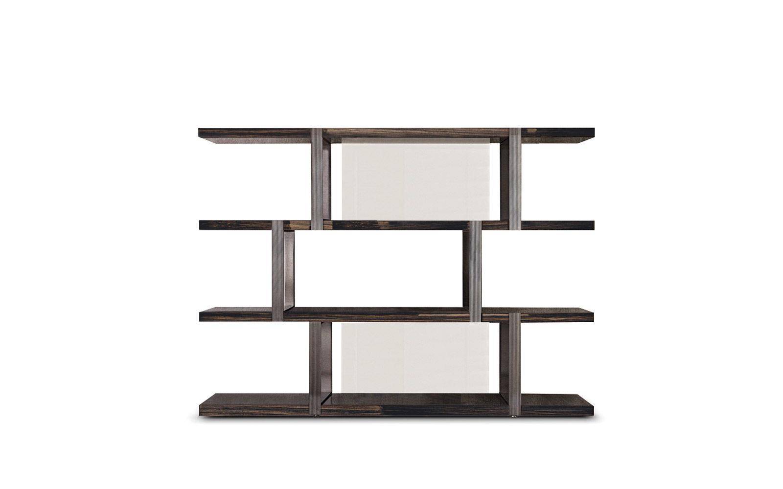 Back panels in White and Granite glossy lacquer or matt lacquered palisander finishes make even more interesting the striking effect created by the interplay of full and empty spaces. Dalton transforms the archetype of the bookcase into a focal point of the living room, enhanced with details sporting a strong decorative appeal, but far from any form of excess or ostentation.