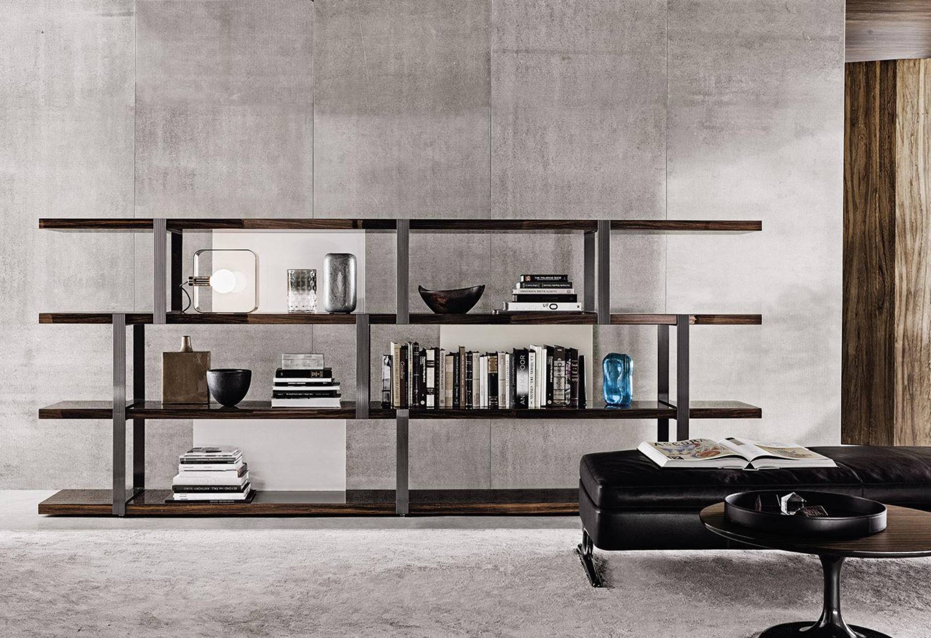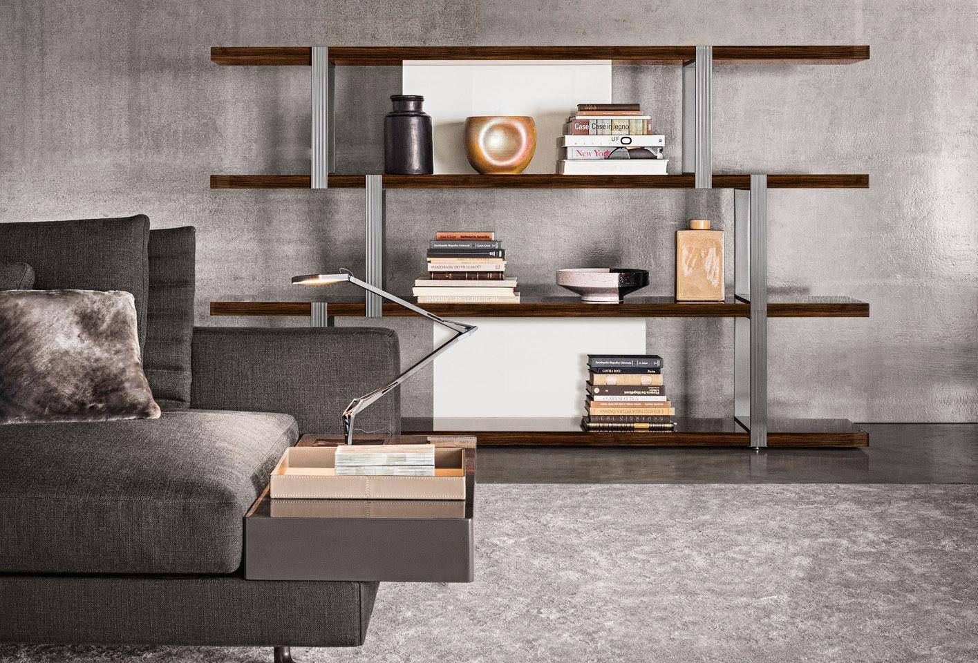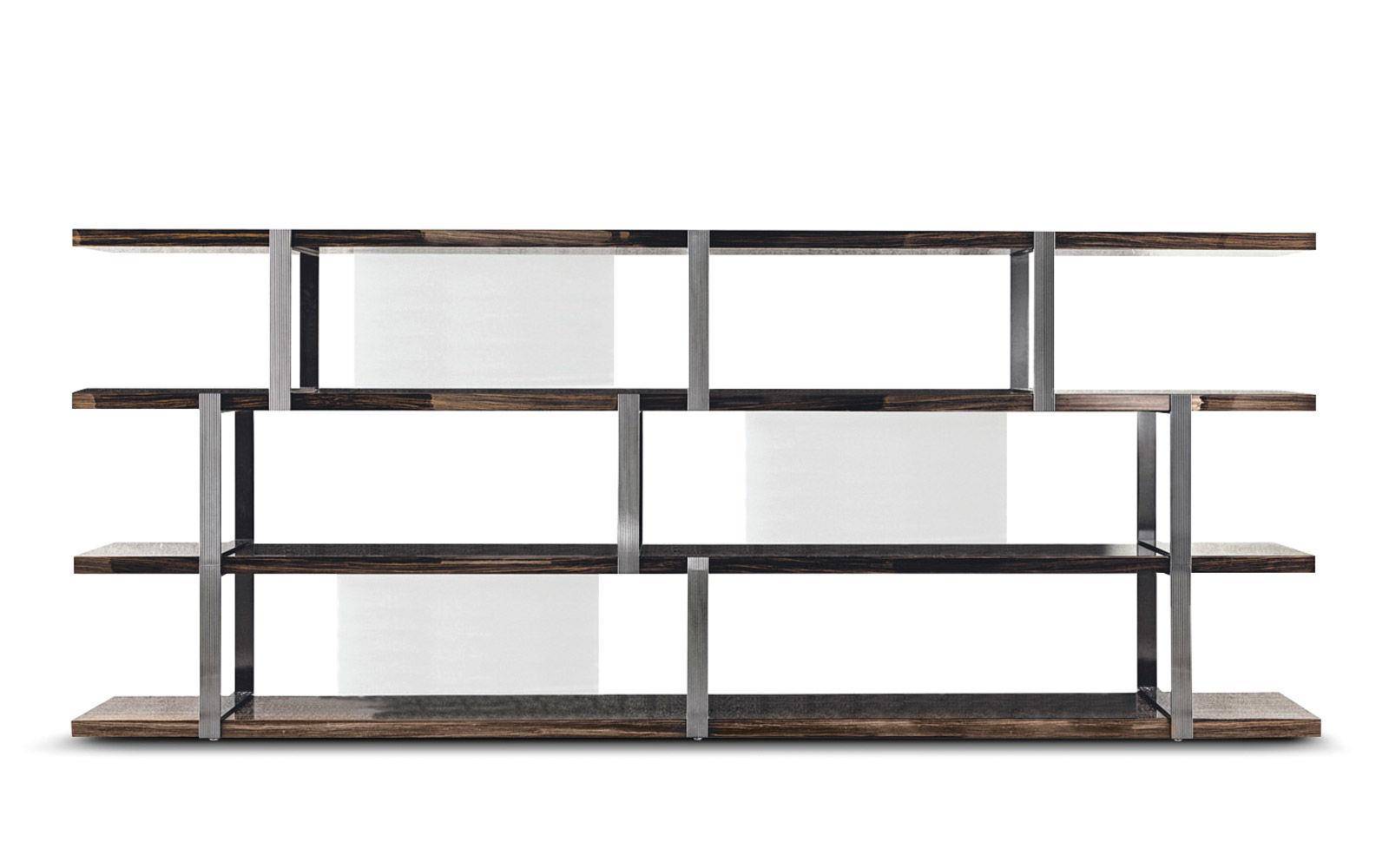 Back panels in White and Granite glossy lacquer or matt lacquered palisander finishes make even more interesting the striking effect created by the interplay of full and empty spaces. Dalton transforms the archetype of the bookcase into a focal point of the living room, enhanced with details sporting a strong decorative appeal, but far from any form of excess or ostentation.