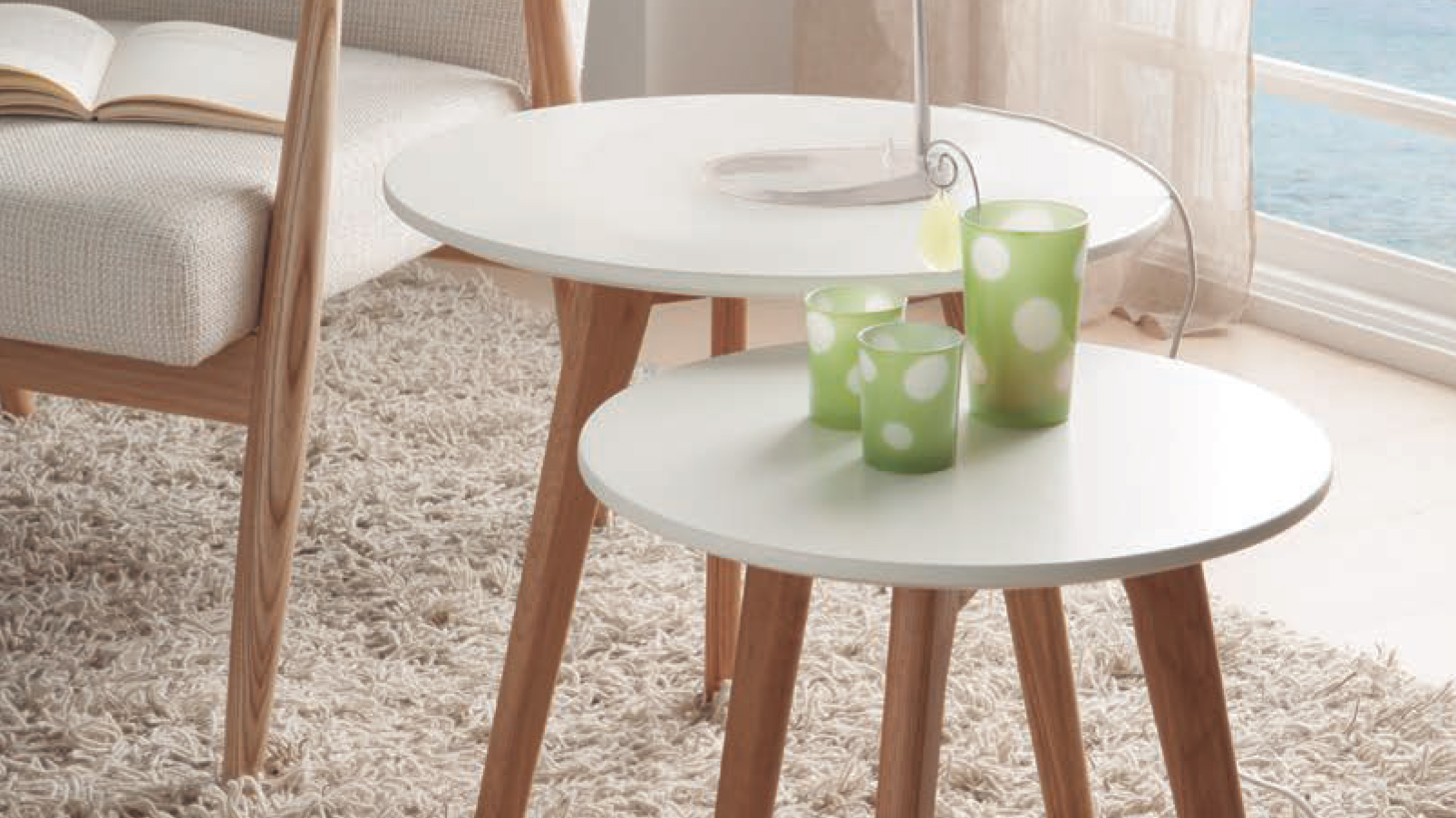 White coffee table. Set of two tables with natural oak legs.