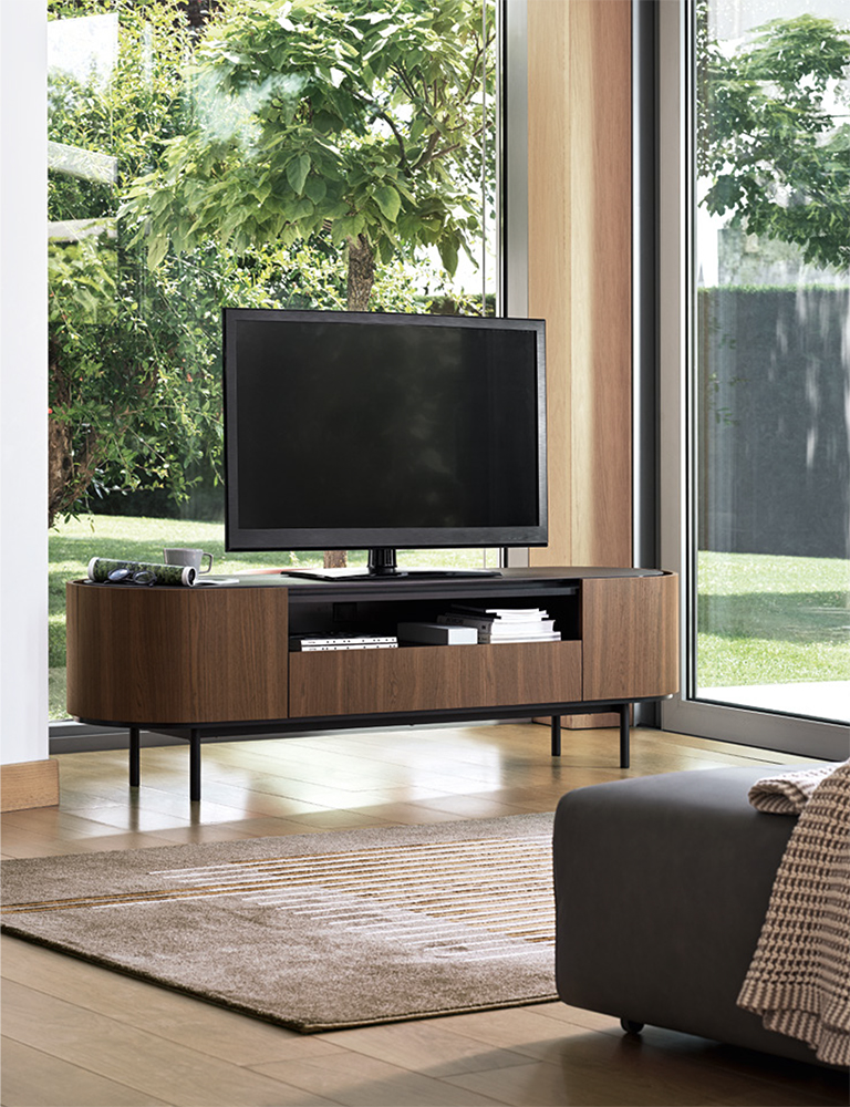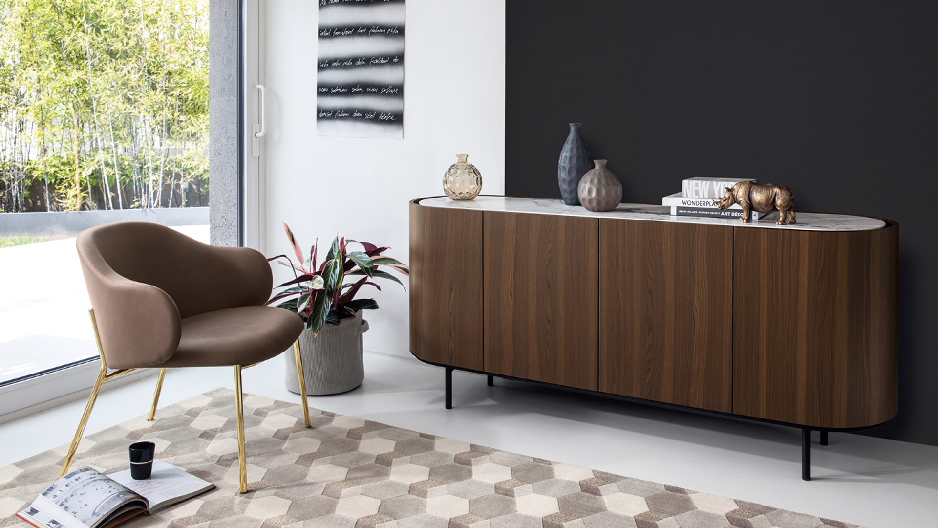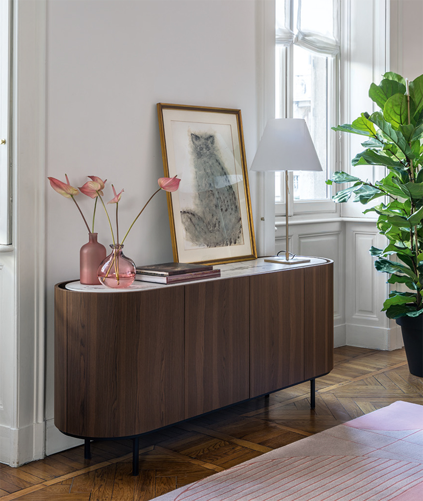 The Lake sideboard is a living-area piece which stands apart for its sleek harmonious lines. On a raised base, it has an oval shape and its beauty is enhanced by the ceramic top which is slightly set back from the edge, creating a space between door and top which is useful for opening the doors and drawers. This item has been veneered all over, making it ideal for a whole variety of uses.