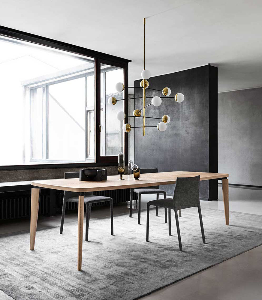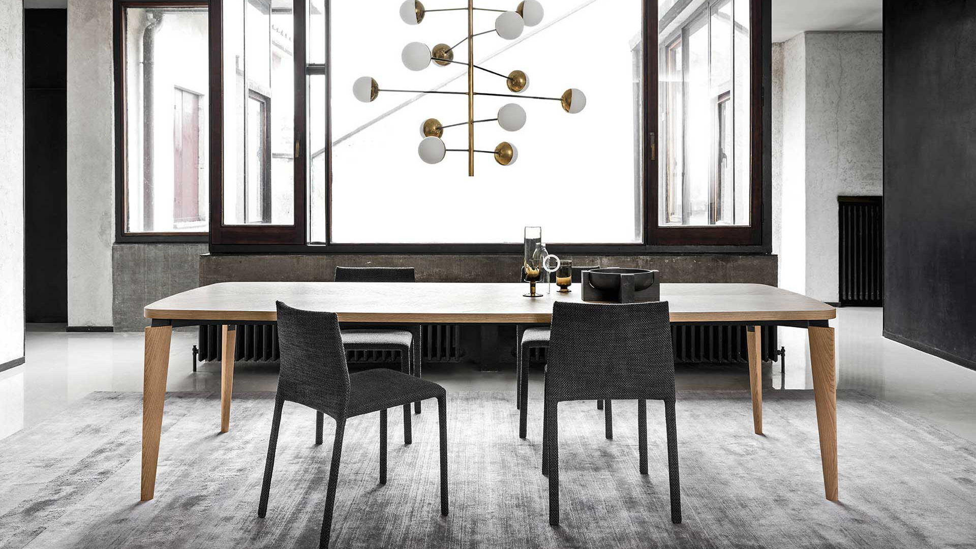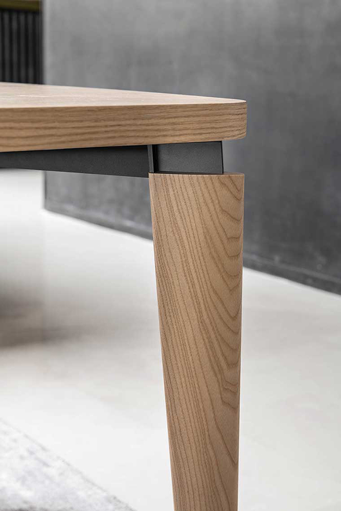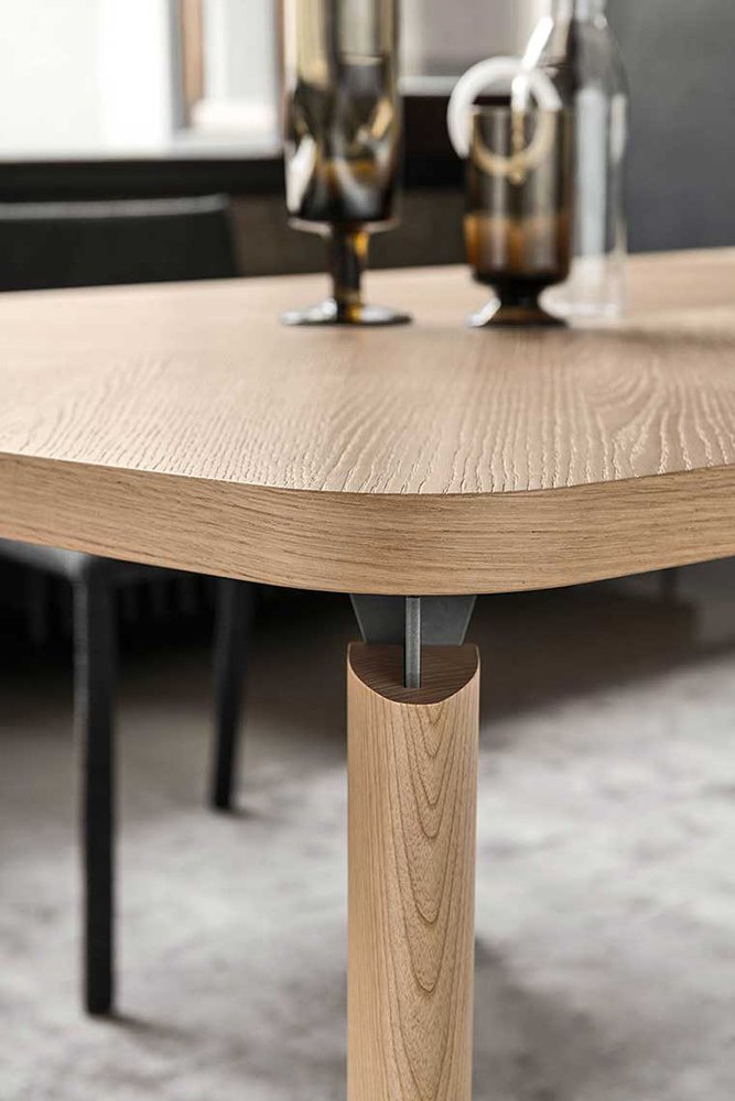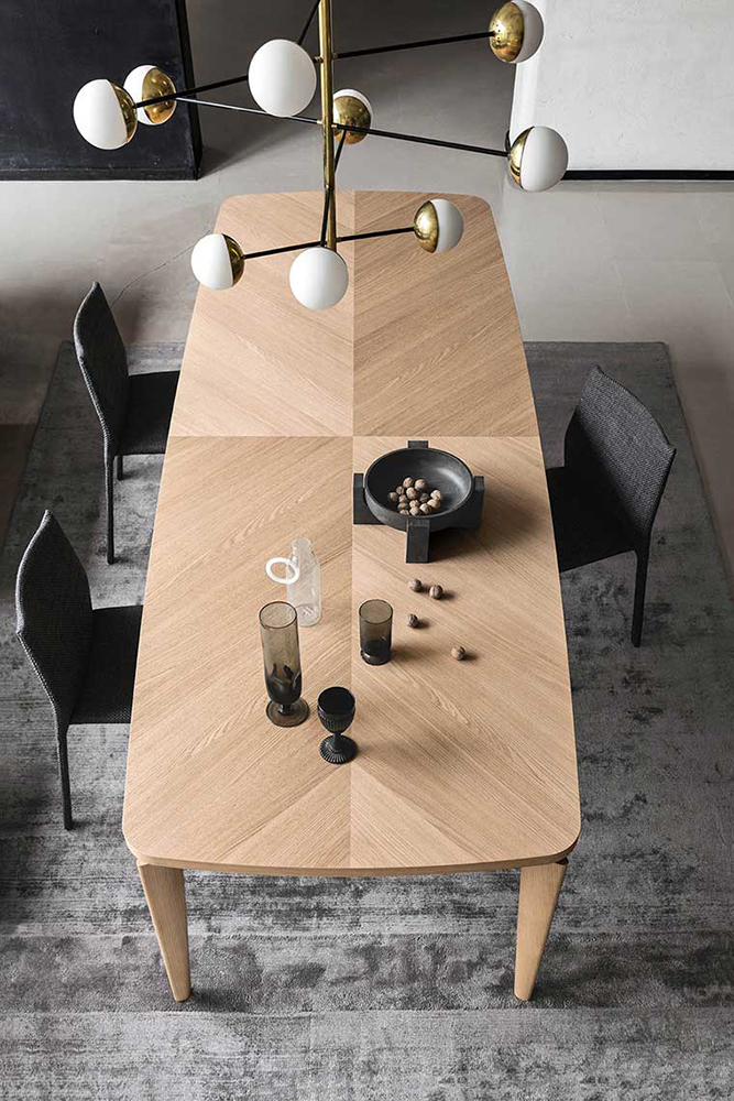 The table features sophisticated geometry and intervals between the elements that make the composition very expressive. The top, defined by a line that is a mixture of half straight and half curvilinear, is divided into 4 quarters which create a typical design from traditional carpentry with the wood grain. An iron plate connects and, at the same time, visually separates the top from the 4 legs which have an irregular conical cross-section, rounder at the base and more oval at the top end. FYRA comes in all the Fashion Wood and matt lacquered oak finishes.