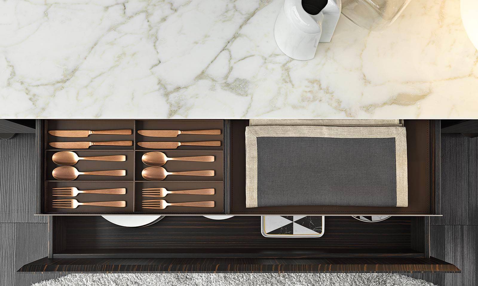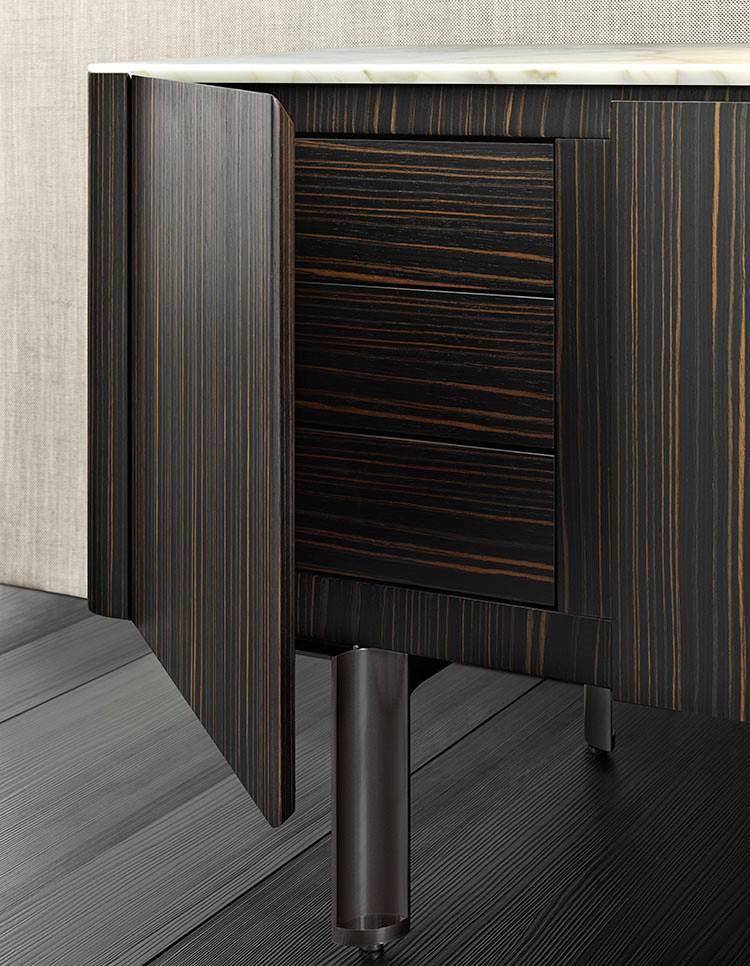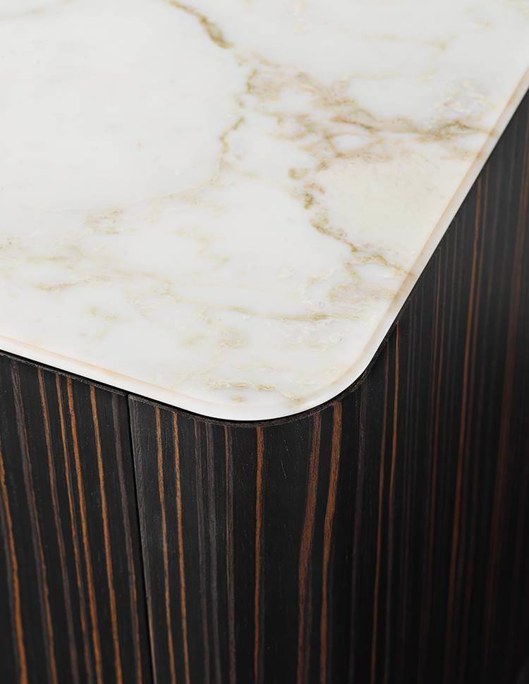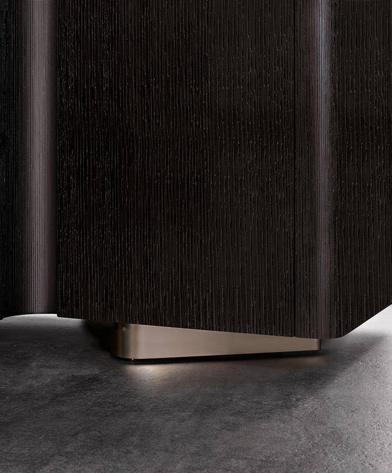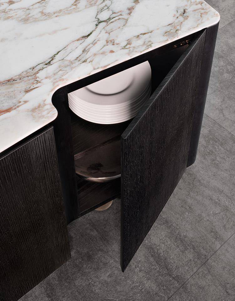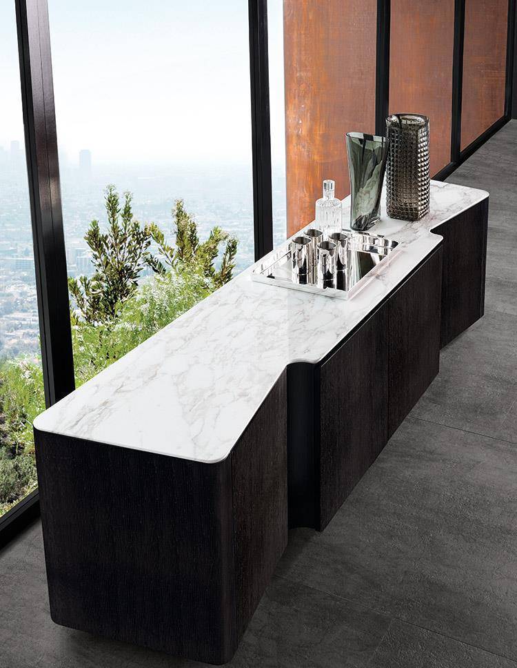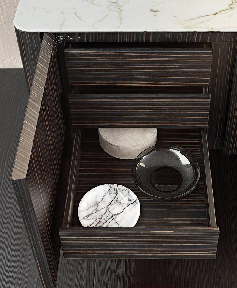 Synonym of refined cabinet-making and high-end technology, they have in common the preciousness of the materials, from the brushed ash or the opaque ebony of the structure to the Calacatta marble or the flush-fitted tops in wood matching the colour of the structure, to the glossy painted metal base.