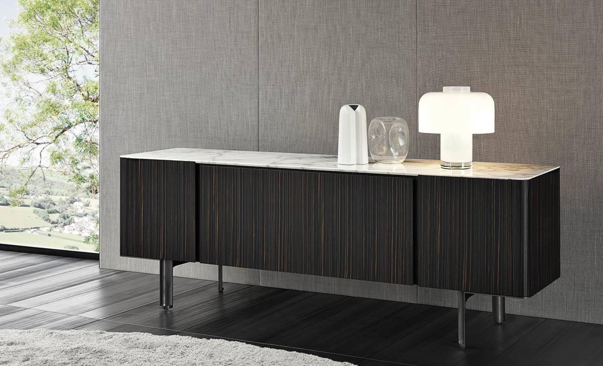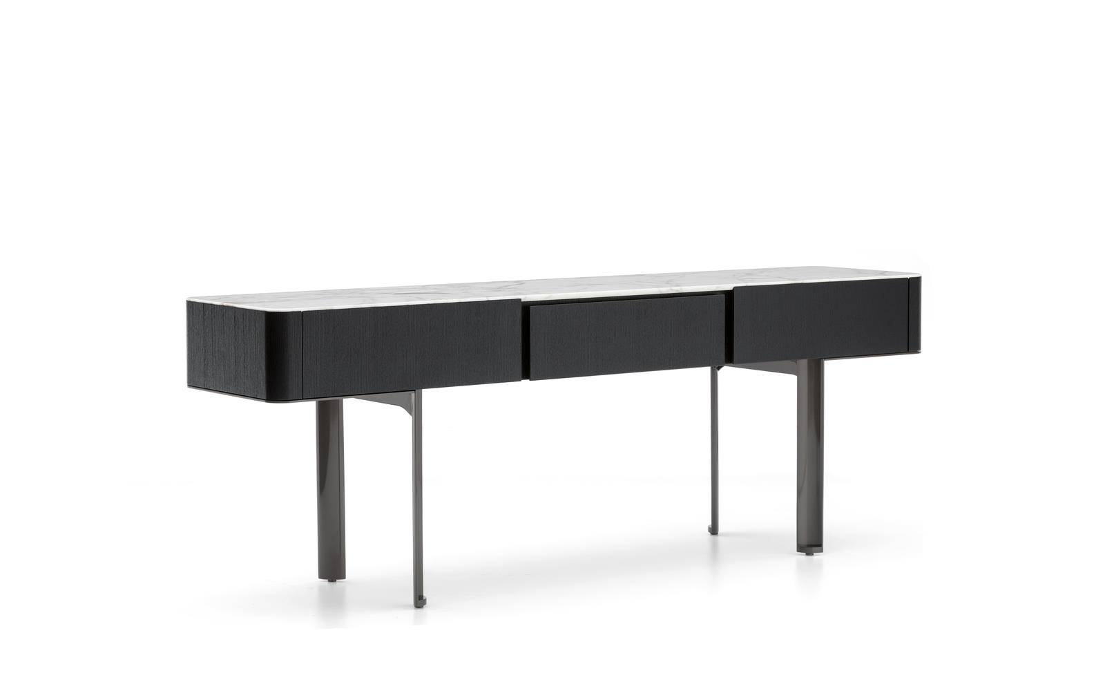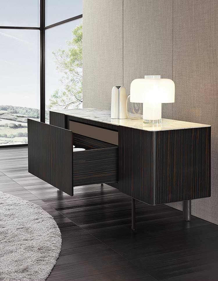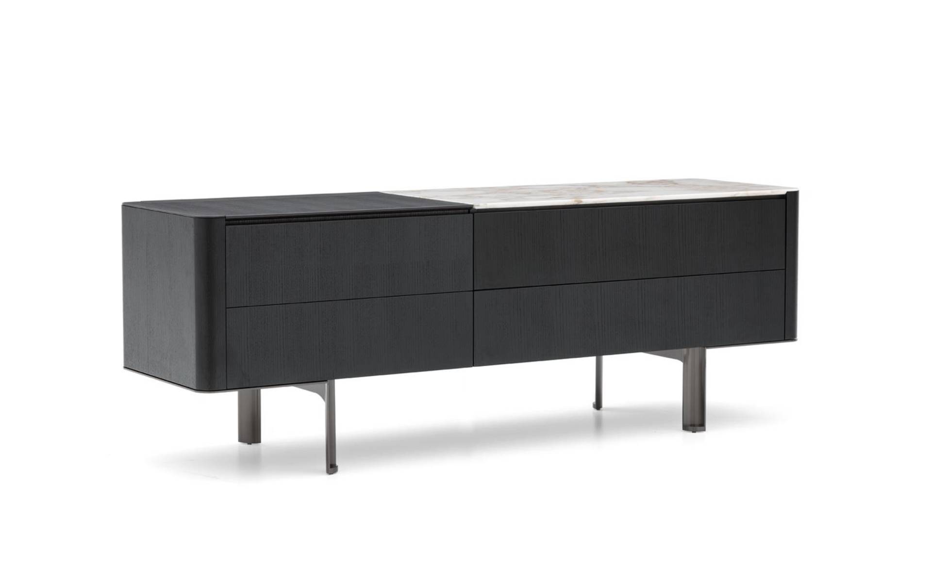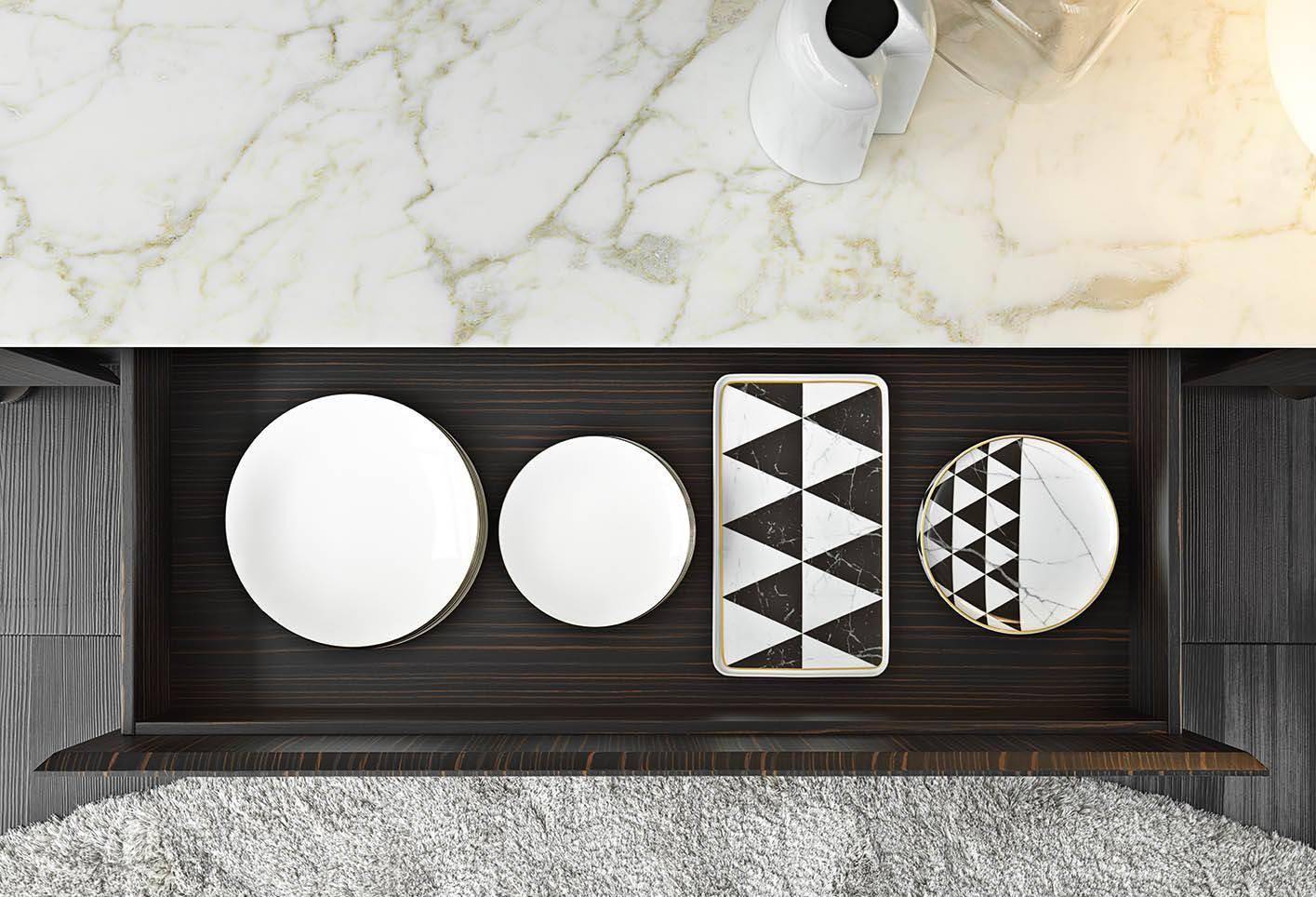 Synonym of refined cabinet-making and high-end technology, they have in common the preciousness of the materials, from the brushed ash or the opaque ebony of the structure to the Calacatta marble or the flush-fitted tops in wood matching the colour of the structure, to the glossy painted metal base.